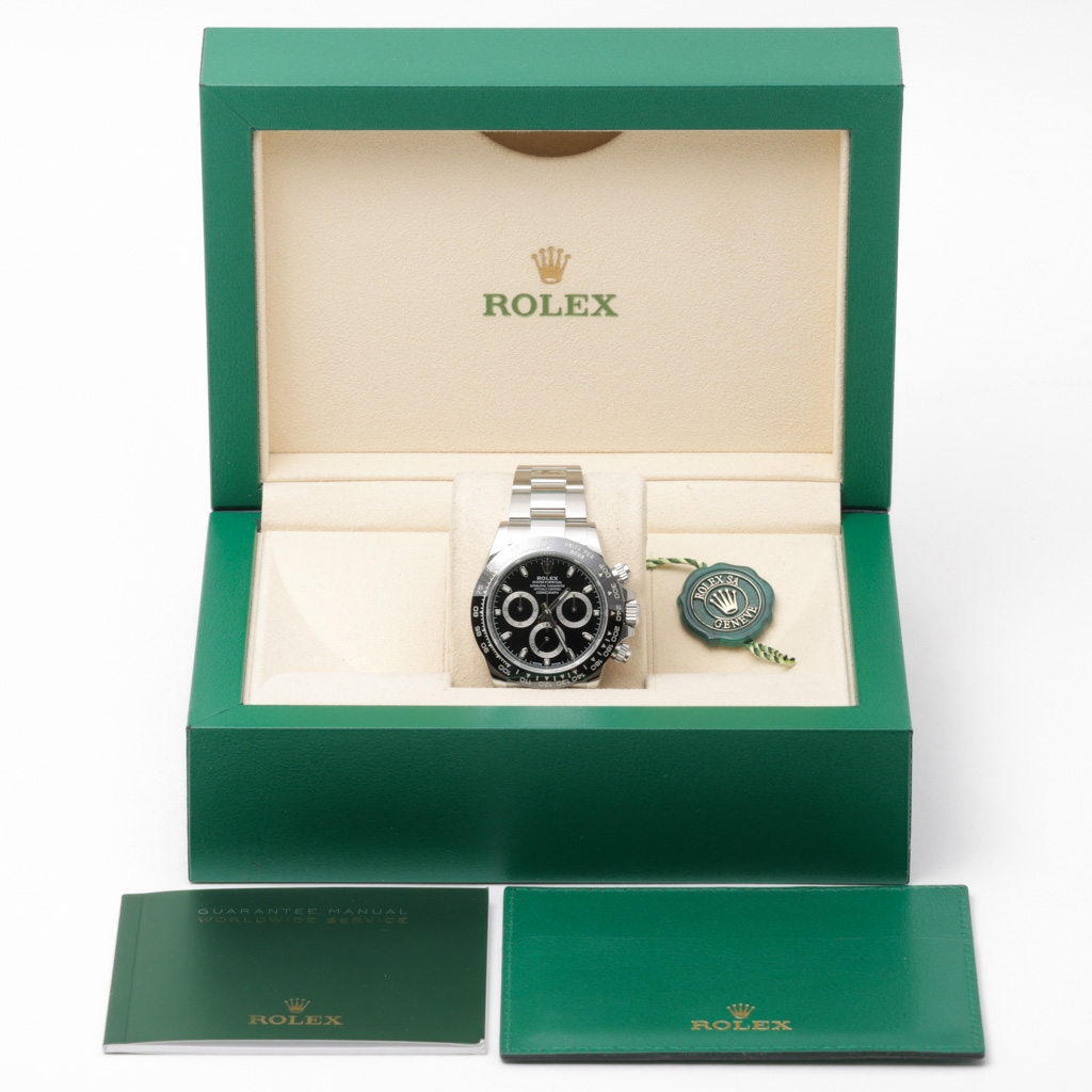This example is the reference 116500LN and is powered by the Rolex Calibre 4130 automatic chronograph movement. Entirely designed and manufactured in-house, the Calibre 4130 is celebrated for its efficiency, reliability, and reduced component count, offering exceptional long-term performance and a 72-hour power reserve. Dated to 2023, this piece represents one of the final years of the 116500LN before its discontinuation, further enhancing its desirability.