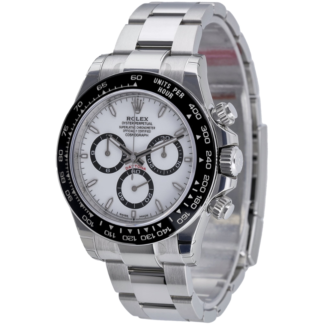 A Rolex Daytona Watch, Stainless Steel with a Black Bezel on a White Dial with Black Subdials