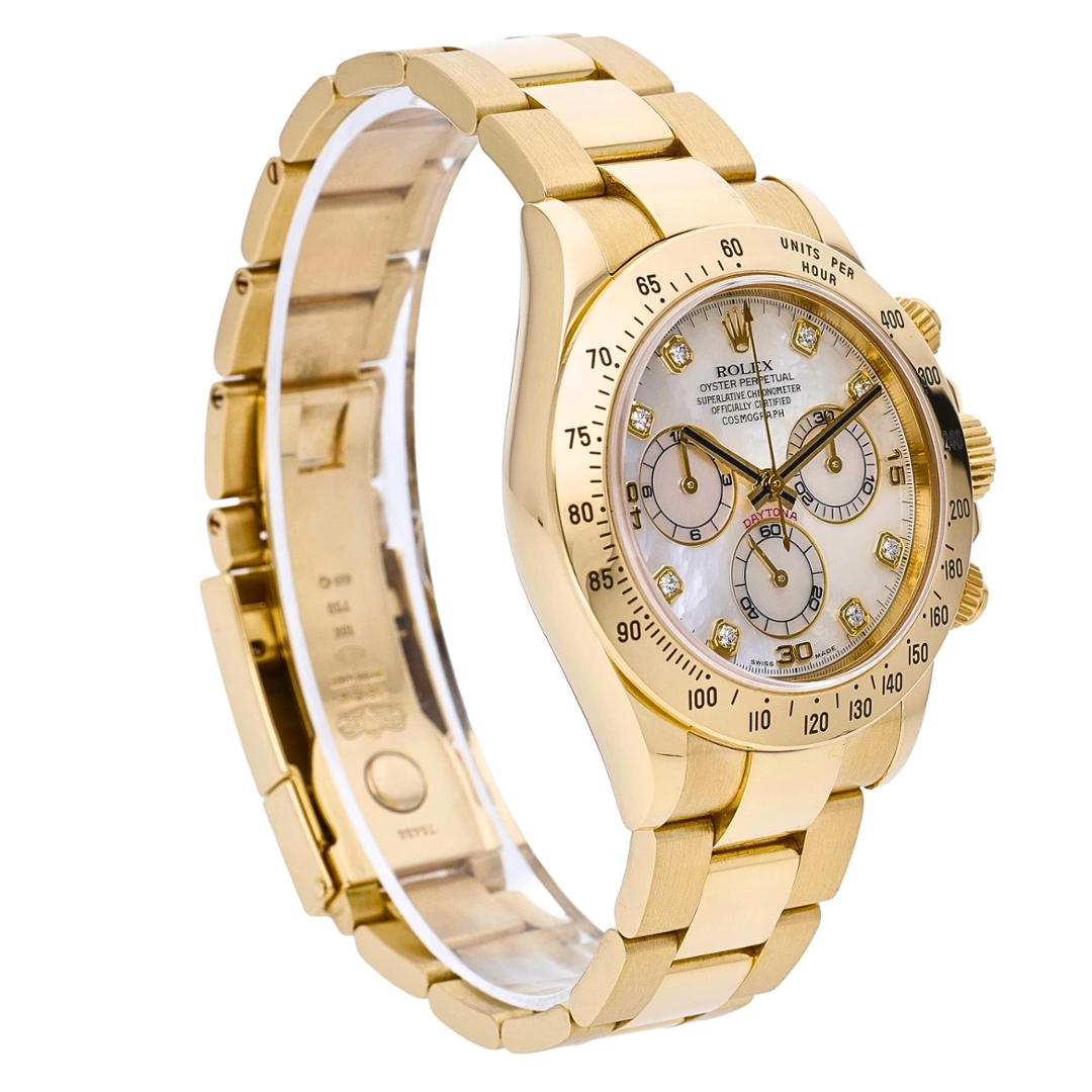 A Rolex Daytona Watch in full 18ct yellow gold, presented in immaculate condition, showcasing one of the most luxurious variations of this iconic chronograph. The 40mm case is complemented by a matching Oyster bracelet, delivering a bold yet refined presence on the wrist. The standout feature is the mother-of-pearl dial, enhanced with original Rolex diamond-set hour markers, offering a subtle iridescence that shifts beautifully under changing light while maintaining the classic Daytona layout.