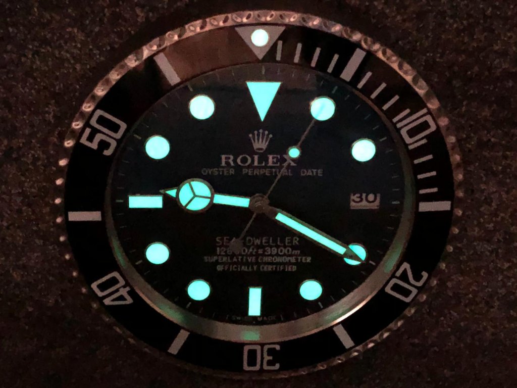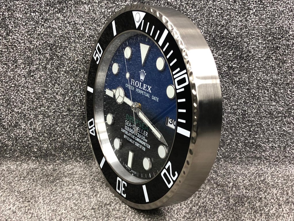 A striking stainless steel replica Rolex DeepSea Sea-Dweller wall clock, designed to capture the unmistakable presence of one of the world’s most iconic dive watches. Featuring a bold black and blue gradient “Deepsea” dial, luminous-style hour markers, and the signature unidirectional bezel design, this piece delivers exceptional visual impact in any setting. The sweeping second hand provides a smooth, continuous motion, enhancing its premium feel.