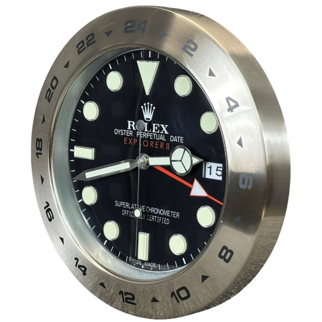 A stainless steel replica Rolex Explorer wall clock, featuring a sharp black dial paired with a brushed silver-tone bezel that delivers a clean and purposeful take on this iconic tool watch design. The high-contrast layout is enhanced by bold hour markers and signature Mercedes hands, creating a highly legible and instantly recognisable aesthetic inspired by the Explorer’s heritage.