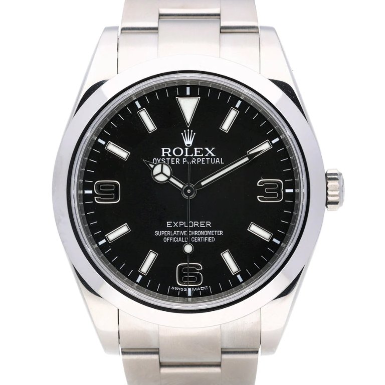 The black dial features the signature 3, 6, and 9 Arabic numerals, along with luminous hour markers and Mercedes-style hands, ensuring excellent legibility in all conditions. The smooth stainless steel bezel and robust Oyster bracelet enhance the watch’s clean, utilitarian aesthetic—crafted for explorers, yet refined enough for everyday wear.