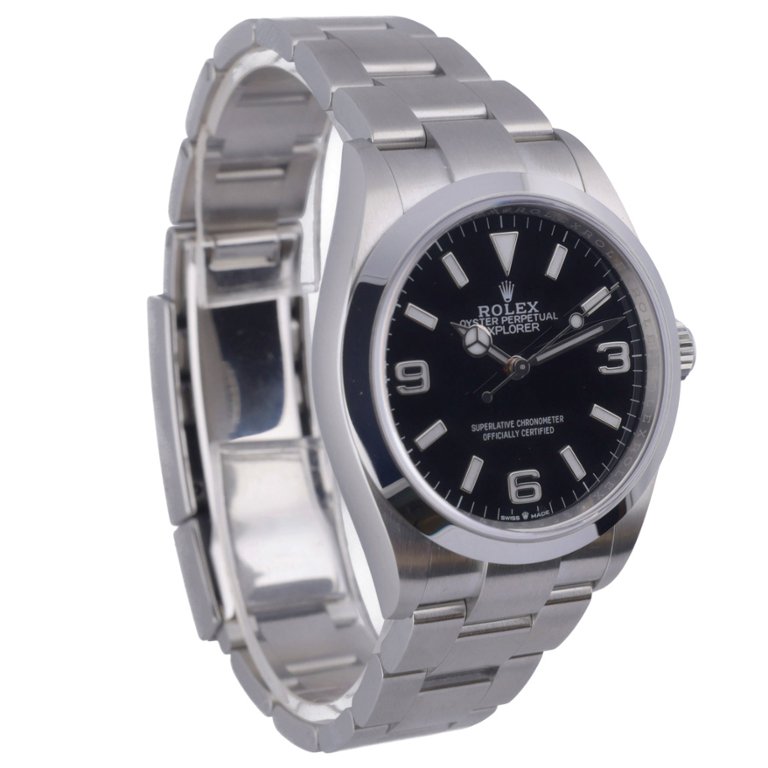 A Rolex Explorer 124270 is a modern interpretation of one of Rolex's most storied tool watches, designed for precision and durability in the most challenging environments. This 2024 edition features a 36mm stainless steel Oyster case, paying homage to the original proportions of the Explorer line. The black dial is clean and highly legible, featuring the characteristic 3, 6, and 9 Arabic numerals alongside Chromalight hour markers and Mercedes hands, which offer long-lasting blue luminescence in low-light conditions.