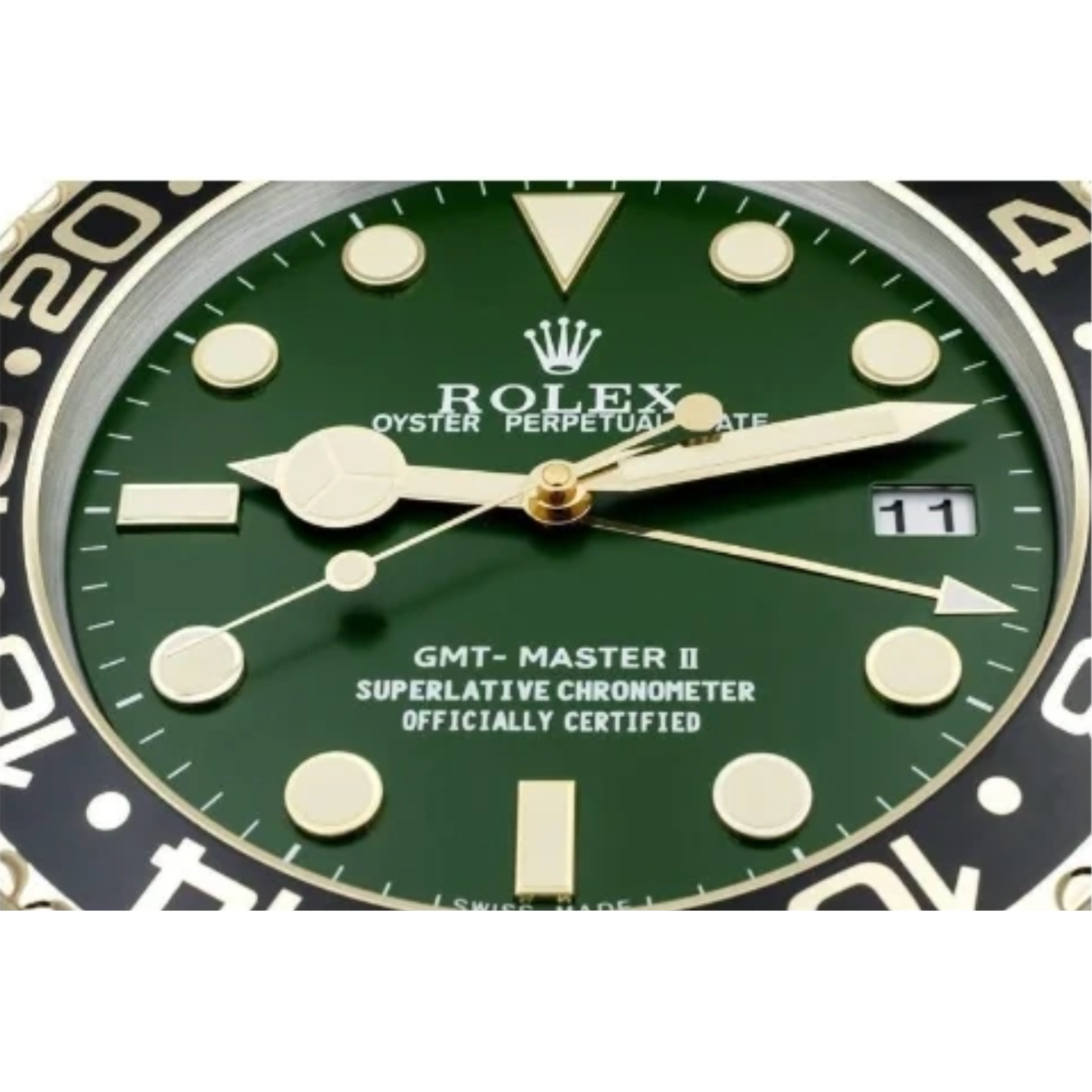 A stainless steel replica Rolex GMT Gold & Green Wall Clock, inspired by the unmistakable design language of the GMT-Master II, presents a bold and eye-catching display. The rich green dial is paired with luminous-style hour markers and signature Mercedes hands, framed by a black and gold 24-hour bezel that captures the essence of the original travel watch aesthetic.