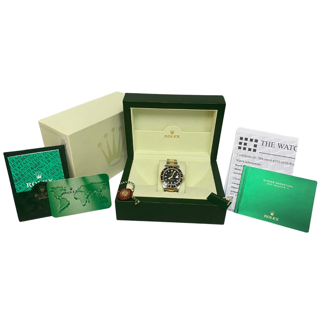 A Bi-Metal Rolex GMT-Master II Watch, Stainless Steel and 18ct Yellow Gold with a Black Bezel and Dial.