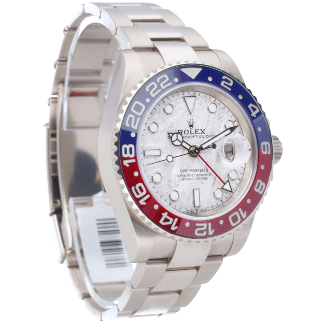 A Rolex GMT-Master II Watch crafted in 18ct white gold, featuring the iconic blue and red Cerachrom “Pepsi” bezel paired with the exceptionally rare meteorite dial. Formed from a genuine slice of iron meteorite, each dial displays a naturally occurring crystalline pattern, ensuring that no two watches are ever identical.