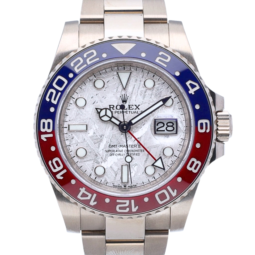 A Rolex GMT-Master II Watch, 18ct White Gold with a Blue/Red Bezel and a Meteorite Dial.