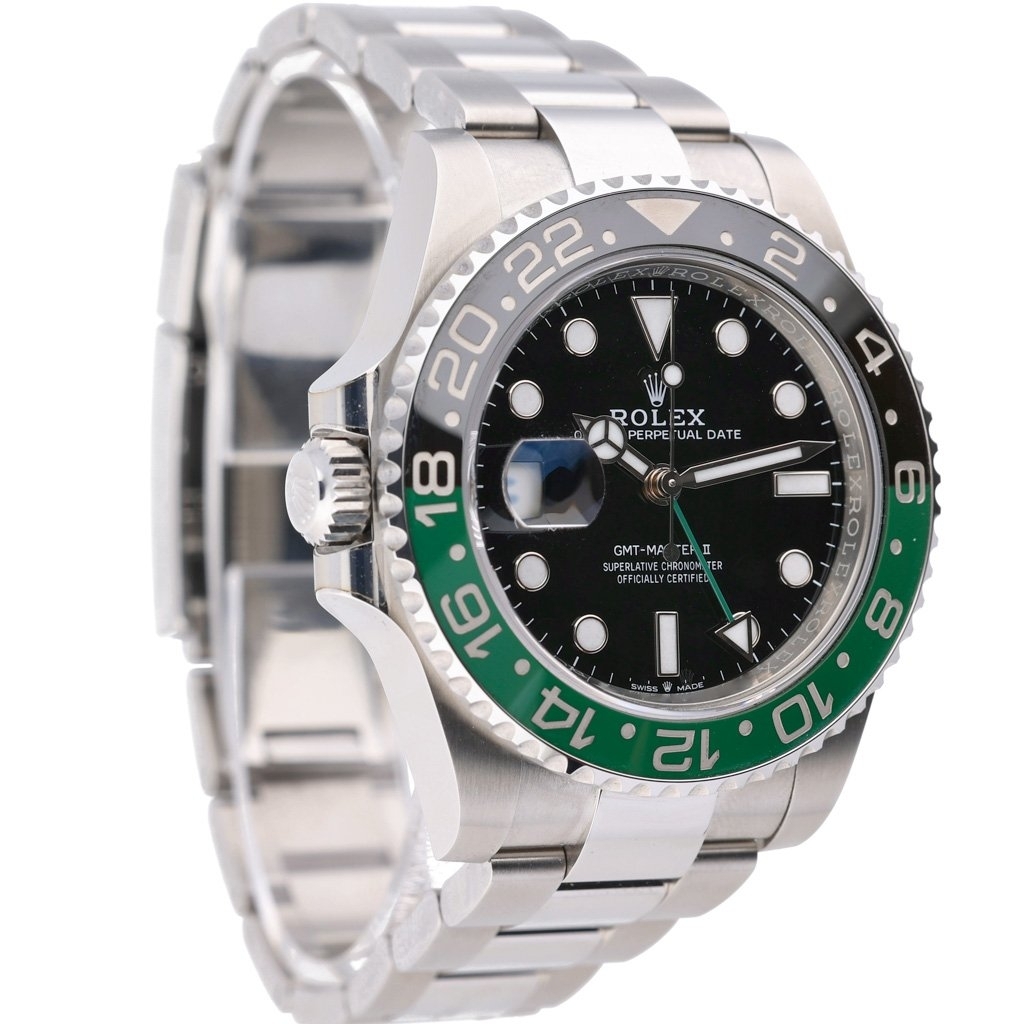 A Rolex GMT-Master II "Sprite", model 126720VTNR, is a striking and innovative timepiece known for its distinctive green and black Cerachrom bezel. Released in 2022, this model features a 40mm stainless steel Oyster case, offering exceptional durability and water resistance up to 100 meters. The black dial is adorned with luminescent hour markers and features a left-sided crown, a unique design element that distinguishes this "Destro" model. The green 24-hour hand allows for dual-time zone tracking, catering to global travellers.