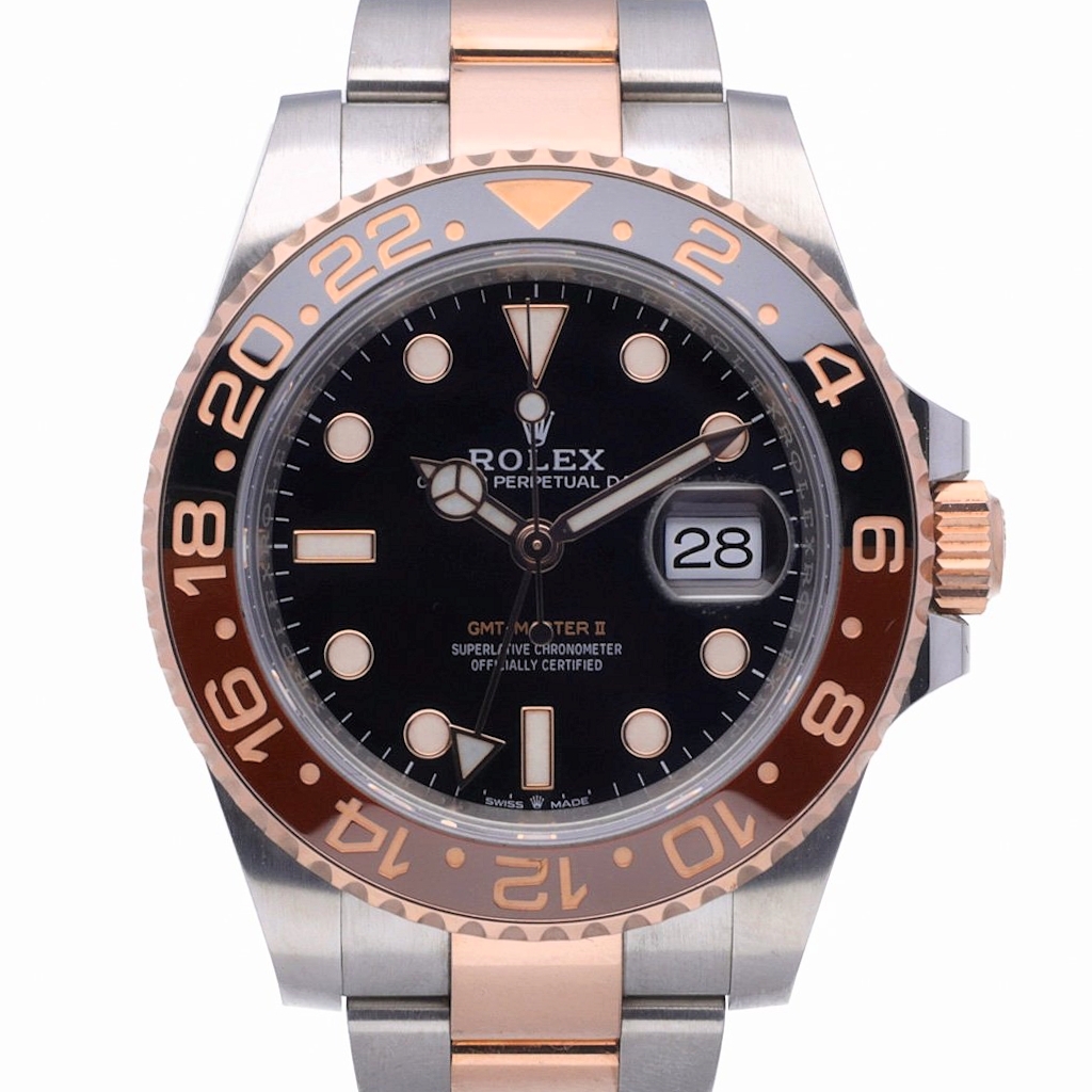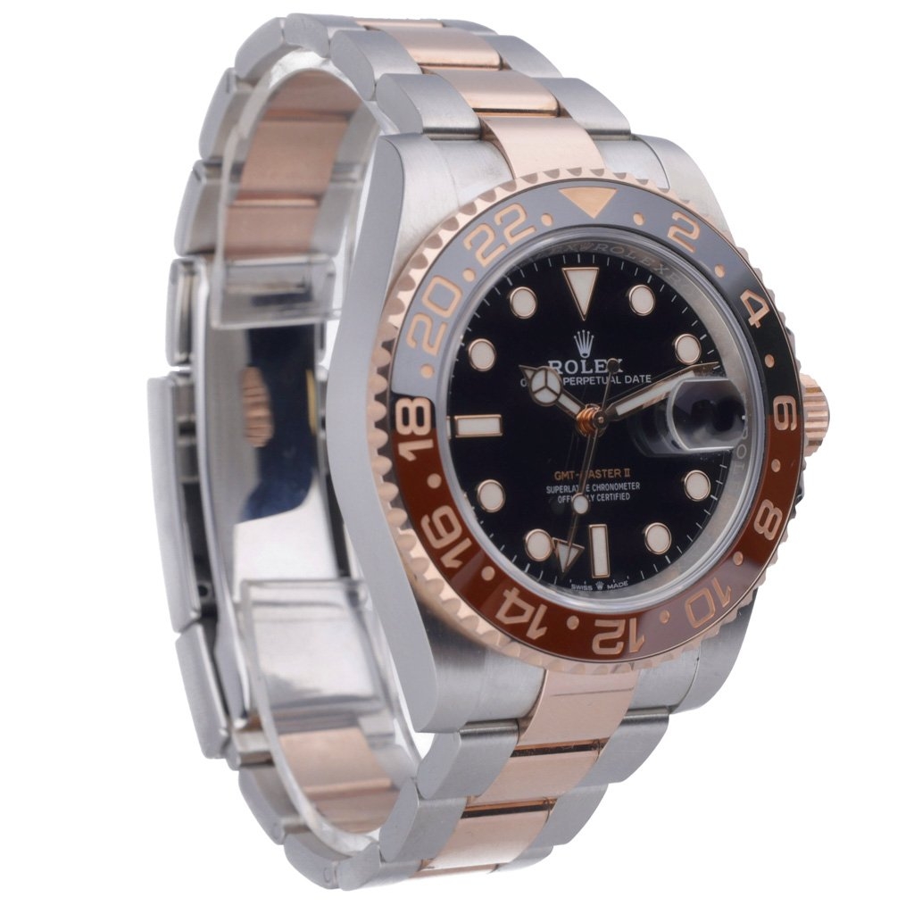 A Rolex GMT-Master II Ref. 126711CHNR "Root Beer" is a masterful blend of elegance and functionality designed for the discerning watch enthusiast. Introduced in 2025, this timepiece showcases Rolex's expertise in crafting luxury watches, featuring a bi-metal construction of stainless steel and 18ct rose gold. The 40mm case offers a robust yet refined presence on the wrist, while the black and brown ceramic bezel provides a sophisticated contrast, allowing for dual-time zone tracking with its 24-hour format.