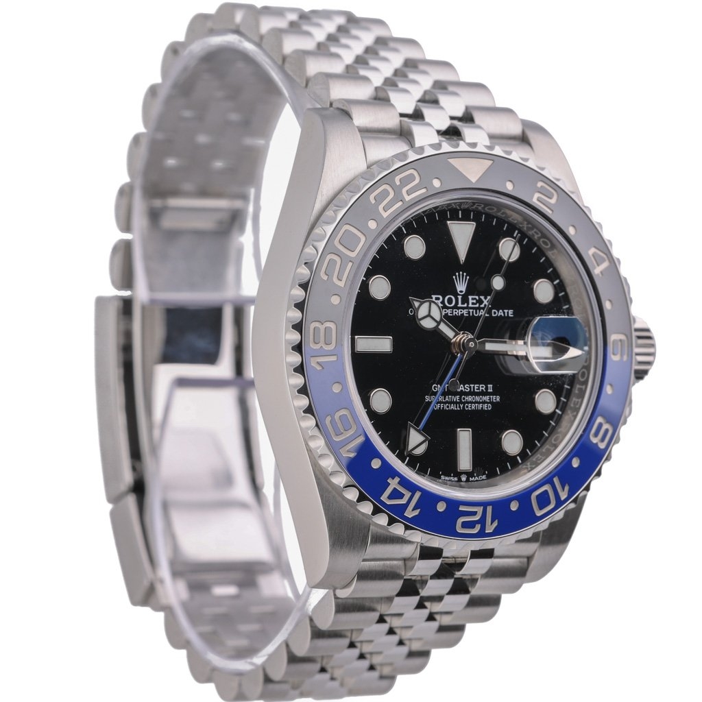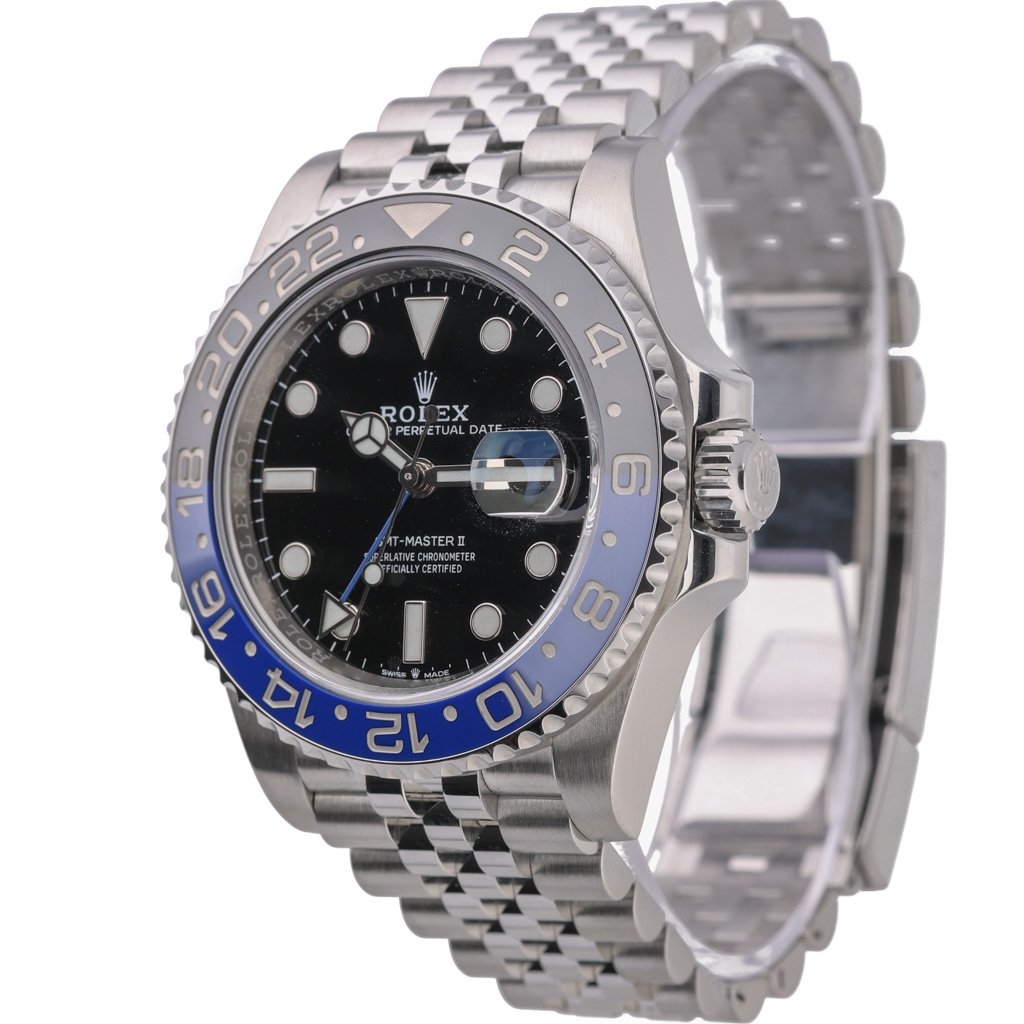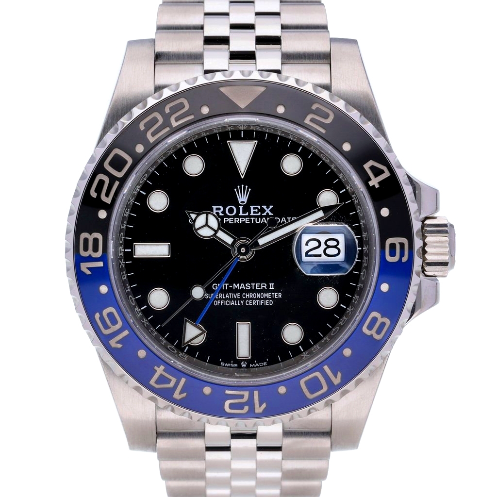 A Rolex GMT-Master II 126710BLNR, crafted in stainless steel and fitted with the iconic black and blue Cerachrom bezel, delivers the unmistakable look collectors know as the Batgirl thanks to its elegant Jubilee bracelet. This 40mm reference blends contemporary Rolex engineering with one of the most recognisable and desirable bezel colourways in the GMT-Master II lineup. Paired with a crisp black dial, it offers superb legibility and a timeless aesthetic that suits both daily wear and travel.