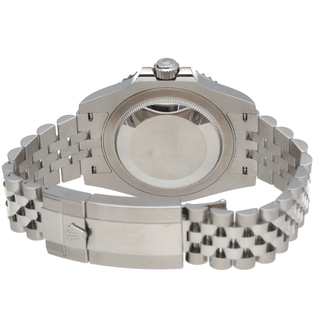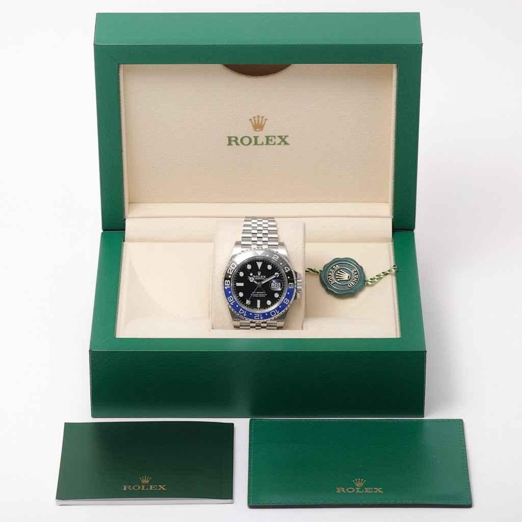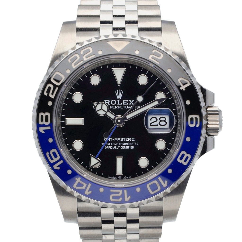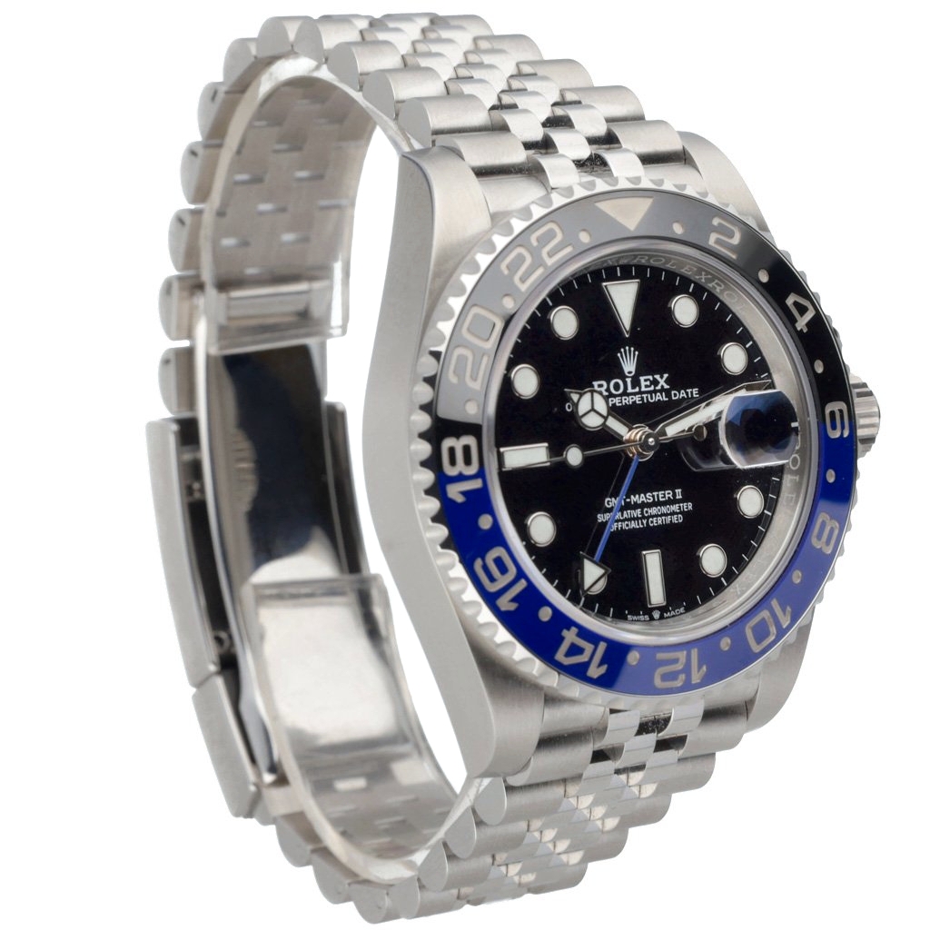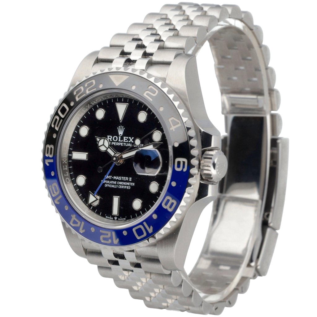 A Rolex GMT-Master II 126710BLNR, crafted in stainless steel and fitted with the iconic black/blue Cerachrom bezel, delivers the instantly recognisable look collectors know as the Batgirl, thanks to its factory Jubilee bracelet. The combination of the bi-colour 24-hour bezel, sharp black dial and five-link bracelet gives this reference a refined yet sporty character, making it one of the most sought-after modern GMTs in the Rolex lineup. The 40mm case offers excellent wrist balance, while the Jubilee bracelet enhances comfort and elevates the aesthetic with its elegant construction.