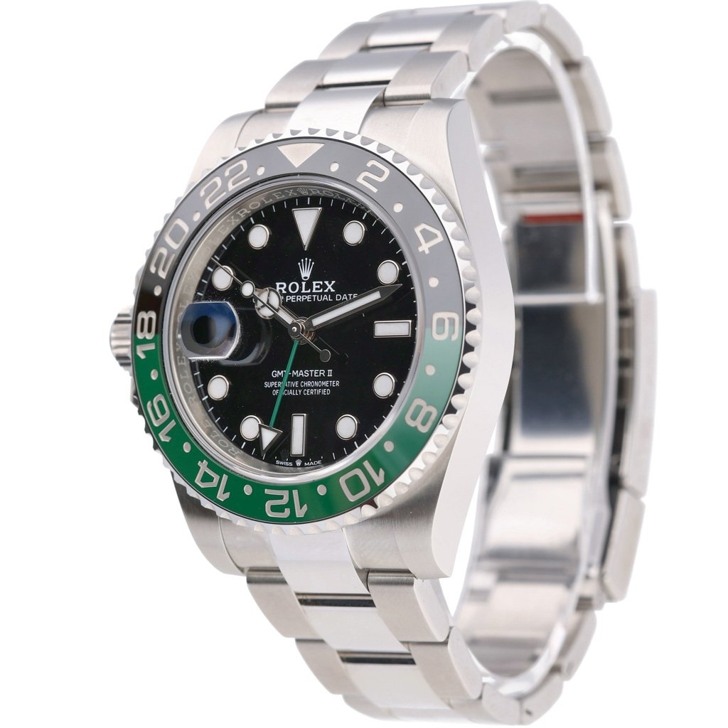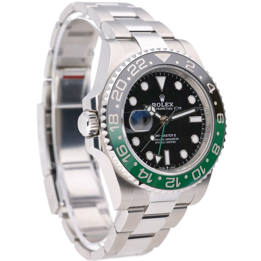 A Rolex GMT-Master II "Sprite", model 126720VTNR, is a striking and innovative timepiece known for its distinctive green and black Cerachrom bezel. Released in 2023, this model features a 40mm stainless steel Oyster case, offering exceptional durability and water resistance up to 100 meters. The black dial is adorned with luminescent hour markers and features a left-sided crown, a unique design element that distinguishes this "Destro" model. The green 24-hour hand allows for dual-time zone tracking, catering to global travellers.