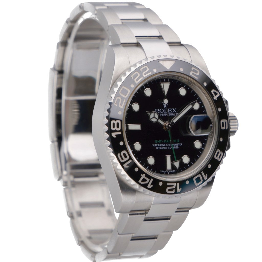 Powered by the Rolex Calibre 3186 automatic movement, the 116710LN provides exceptional accuracy, a 50-hour power reserve, and dual-time zone functionality — making it a favourite among frequent travellers and collectors. The green 24-hour hand, luminous hour markers, and robust construction highlight the GMT-Master II’s commitment to durability, legibility, and performance.