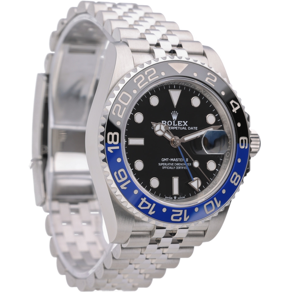 A Rolex GMT Master II 126710BLNR, famously known as the “Batgirl” for its distinctive black-and-blue bezel and Jubilee bracelet. It is a stunning blend of functionality and design. The 40mm stainless steel case offers comfort and presence, while the striking black-and-blue dial adds an undeniable sense of dynamism. The contrast between the bezel and dial colours makes the watch stand out without being overly flashy, embodying Rolex’s signature balance of elegance and utility.