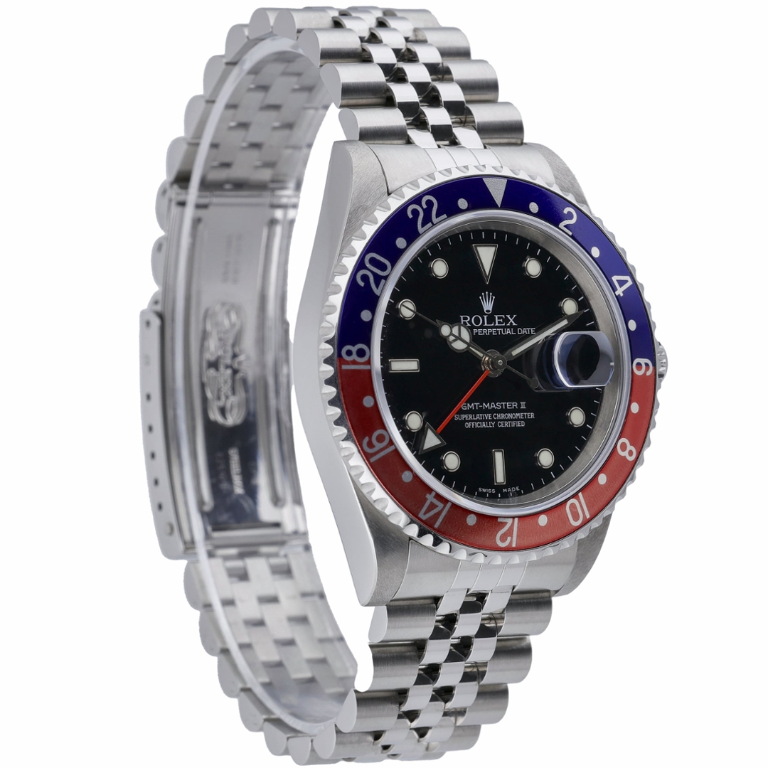 A Rolex GMT-Master II Watch, model 16710, crafted in stainless steel with the iconic red and blue “Pepsi” bezel and a classic black dial. The 40mm Oyster case is paired with the Jubilee bracelet, giving this late-production example a refined yet unmistakably sporty presence. Luminous hour markers, Mercedes hands and the red GMT hand provide excellent legibility, while the aluminium 24-hour bezel allows for simultaneous tracking of multiple time zones.