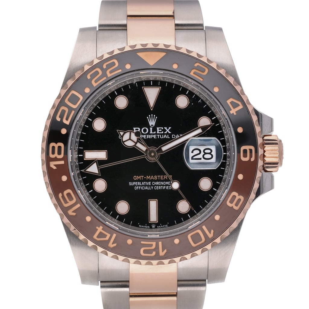 A Rolex GMT-Master II Watch crafted in stainless steel and 18ct Everose gold, featuring the distinctive brown and black Cerachrom bezel paired with a classic black dial. Commonly known among collectors as the “Root Beer”, this striking two-tone configuration blends Rolex’s professional sports watch heritage with the warm tones of Everose gold, creating one of the most recognisable modern GMT-Master II references.