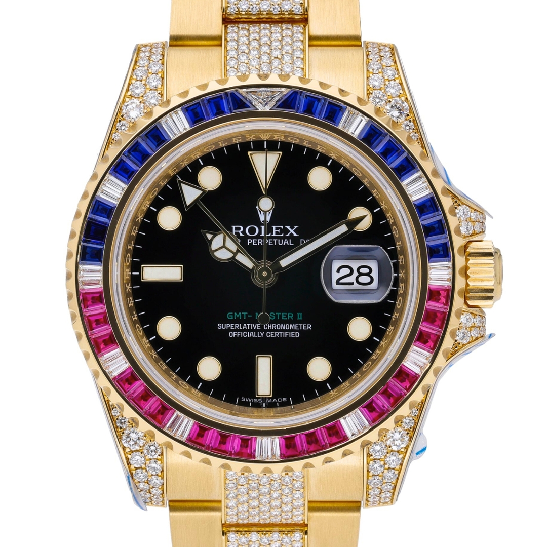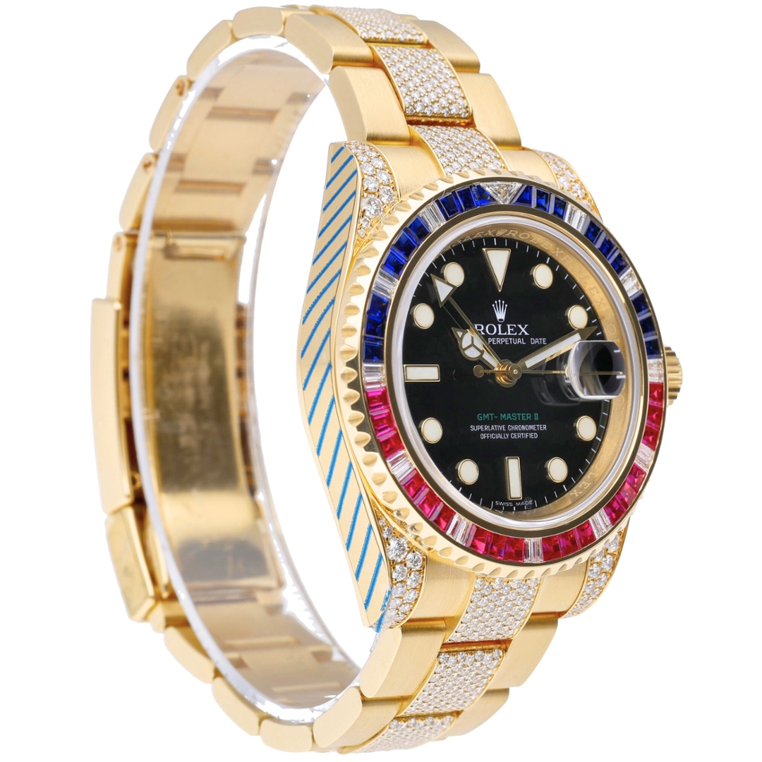 A Rolex GMT-Master II Watch in 18ct yellow gold, elevated by one of the most striking factory-set configurations in the Rolex catalogue. The 40mm Oyster case is paired with a matching gold bracelet, while the black dial delivers a sharp contrast against the vivid bezel set with sapphires, diamonds and rubies. Diamond-set centre links and shoulders add even greater visual impact.