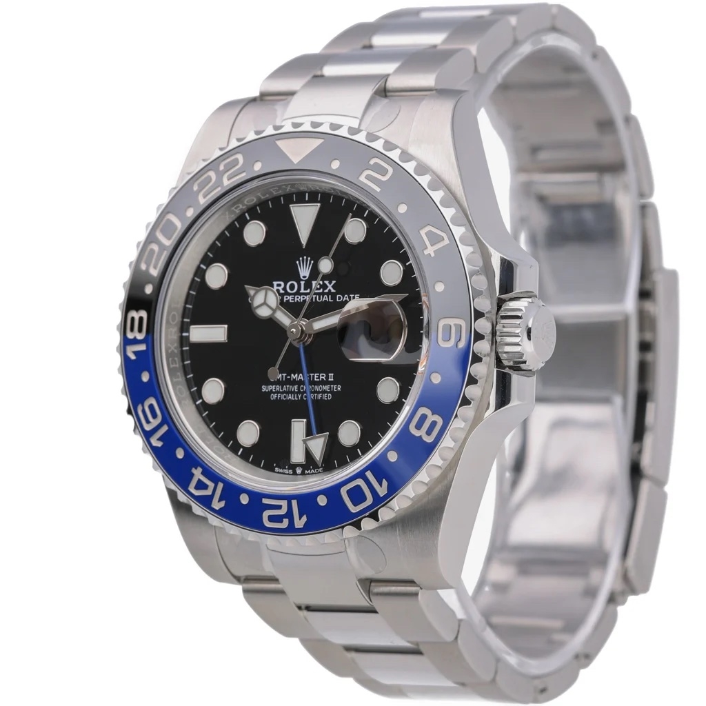 A Rolex GMT-Master II 126710BLNR with an Oyster bracelet, also known as the "Batman" due to its striking black-and-blue bezel, is a sophisticated, versatile timepiece that seamlessly blends luxury with functionality. Introduced in 2023, this watch boasts a 40mm stainless steel case that exudes durability and elegance, making it suitable for casual and formal occasions.