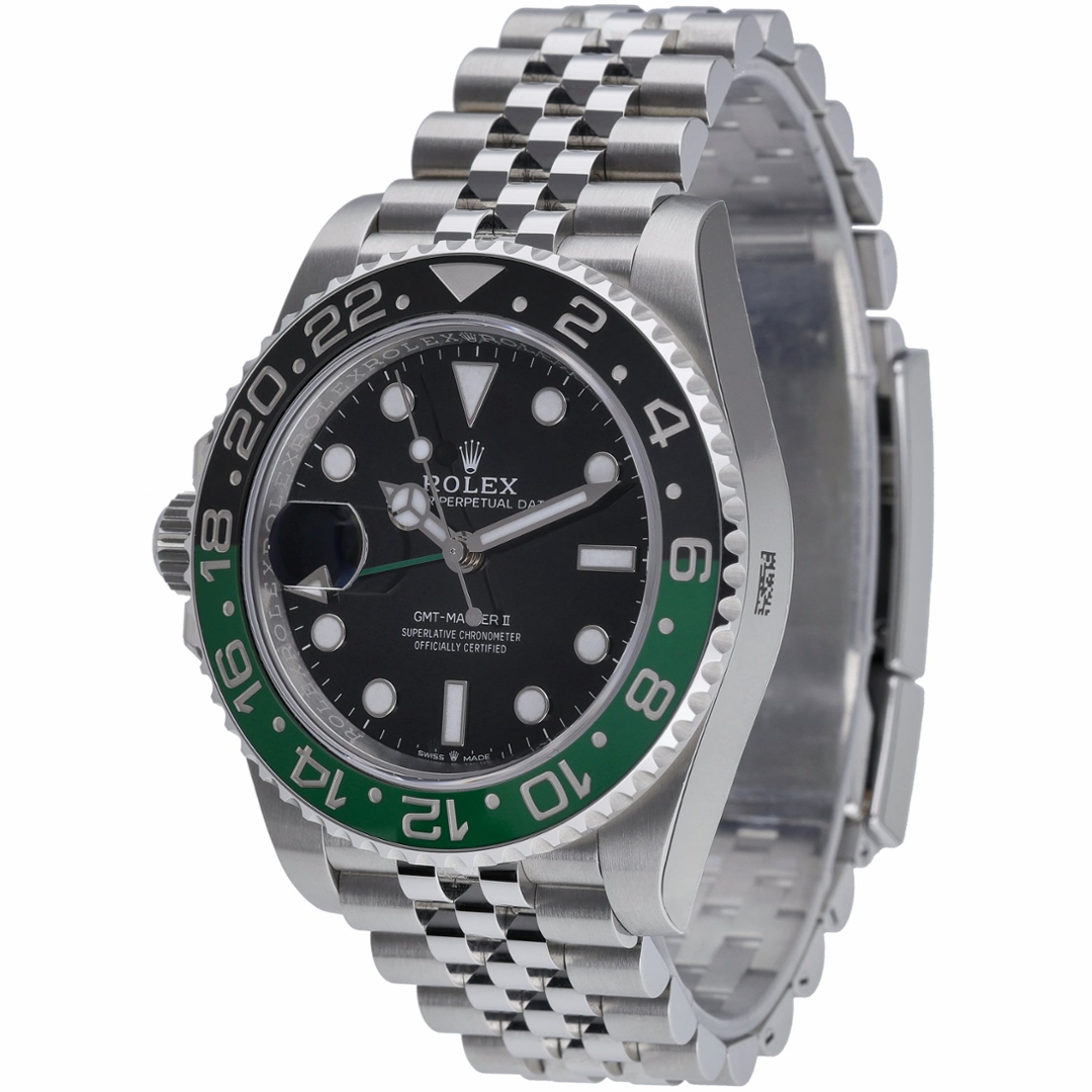 A Rolex GMT-Master II Watch that breaks convention with bold innovation, this 2023 model 126720VTNR—nicknamed the "Sprite"—is one of the most distinctive releases in the modern Rolex lineup. Crafted in robust Oystersteel, the 40mm case is paired with a striking black-and-green Cerachrom bezel, offering a fresh take on the iconic GMT aesthetic.