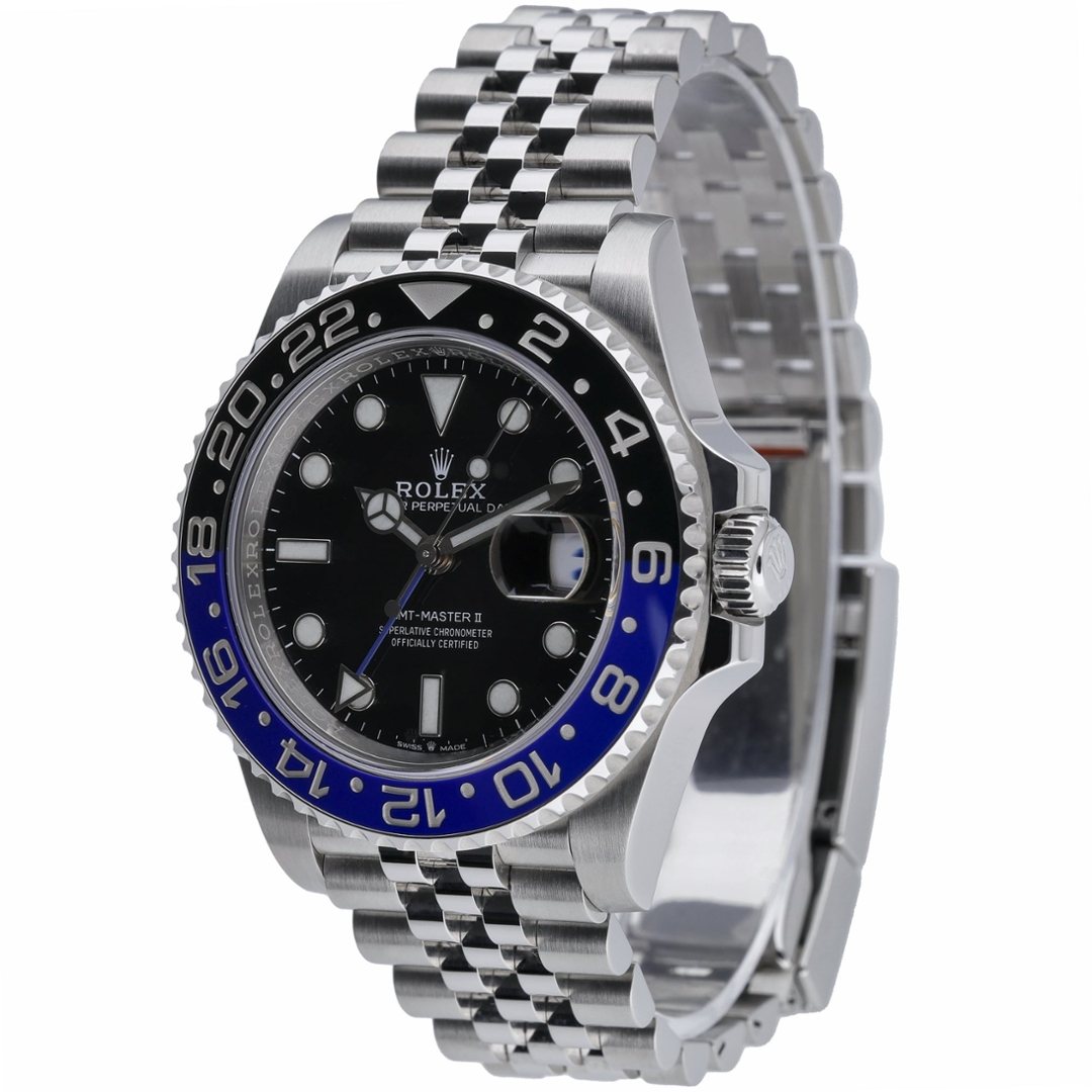 A Rolex GMT-Master II Watch, crafted in stainless steel, featuring the iconic black and blue Cerachrom ceramic bezel insert — often referred to as the "Batgirl." This 2020 model is fitted with a classic black dial, white luminous hour markers, and the recognisable Mercedes hands, offering superior legibility in all conditions. The 40mm Oyster case is water-resistant to 100 metres, secured with a Twinlock winding crown and scratch-resistant sapphire crystal.