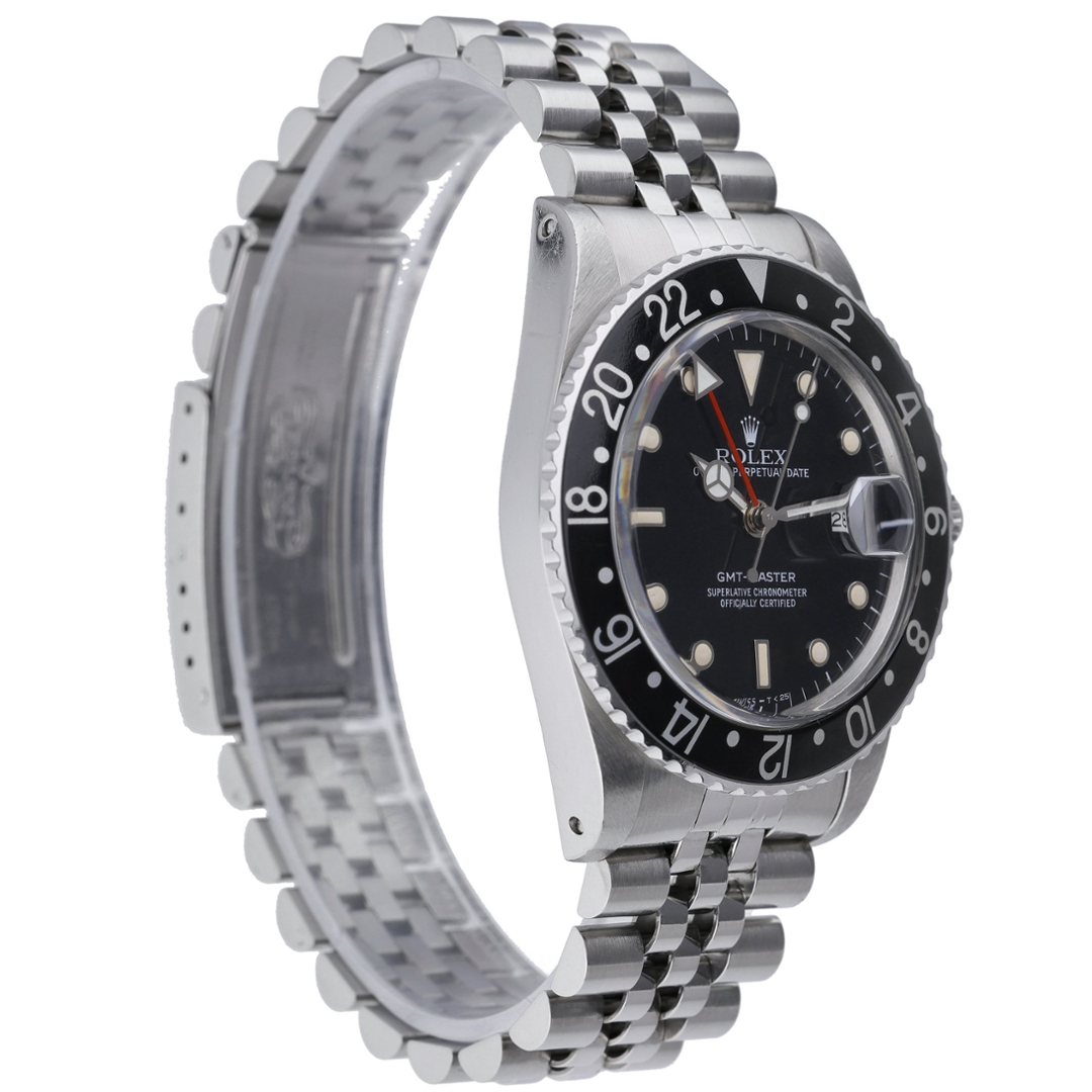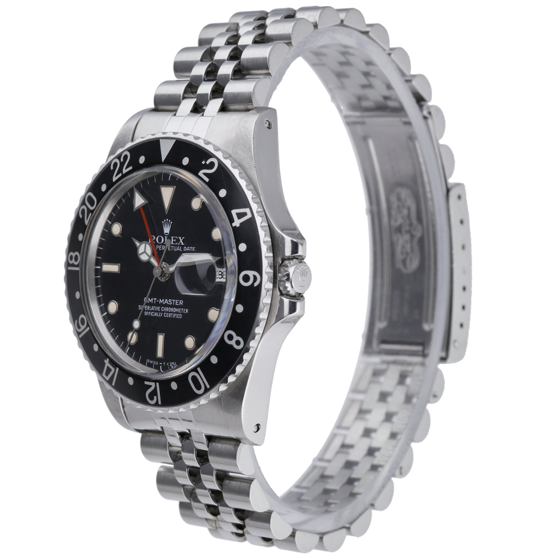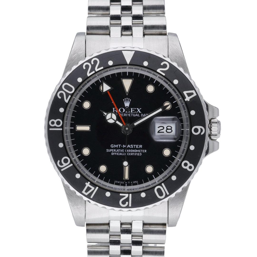 A Rolex GMT-Master Watch that stands as a revered icon in the world of tool watches, this 1986 model 16750 captures the perfect intersection of vintage charm and modern functionality. Crafted in stainless steel with a 40mm case, it features the classic black aluminium bezel insert and matching black dial—a timeless, monochromatic look that remains endlessly versatile.