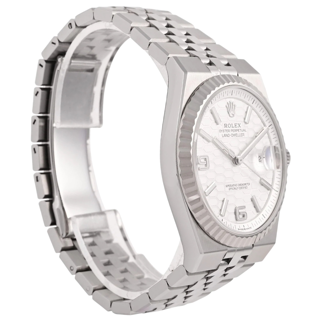 A Rolex Land-Dweller 40 Watch, Stainless Steel with an 18ct White Gold Bezel on an Intense White Honeycomb Motif Dial and a Flat Jubilee Bracelet