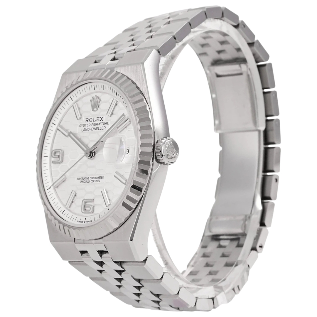 A Rolex Land-Dweller 40, reference 127334 (in the new 2025 Rolex Box), is crafted in Oystersteel and fitted with an 18ct white gold fluted bezel and a Flat Jubilee bracelet — a bold new entry in Rolex’s 2025 catalogue.