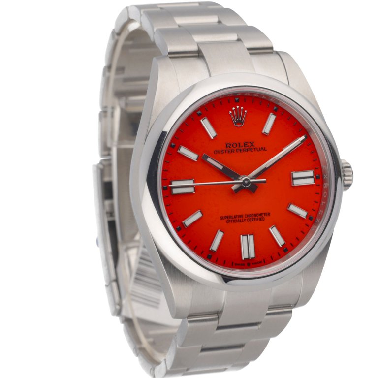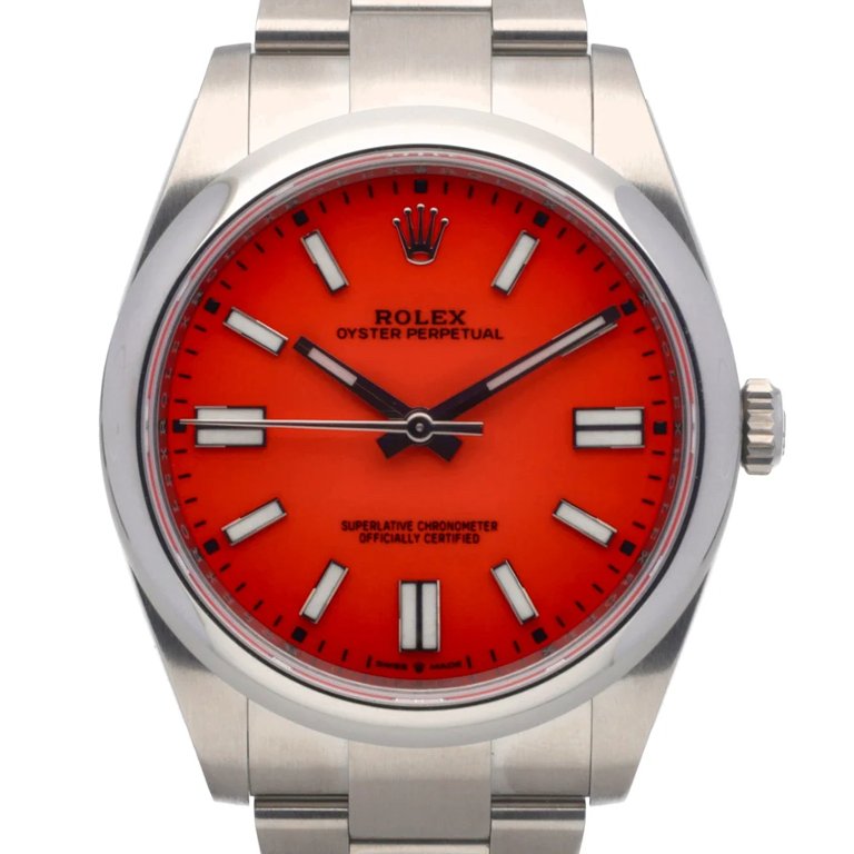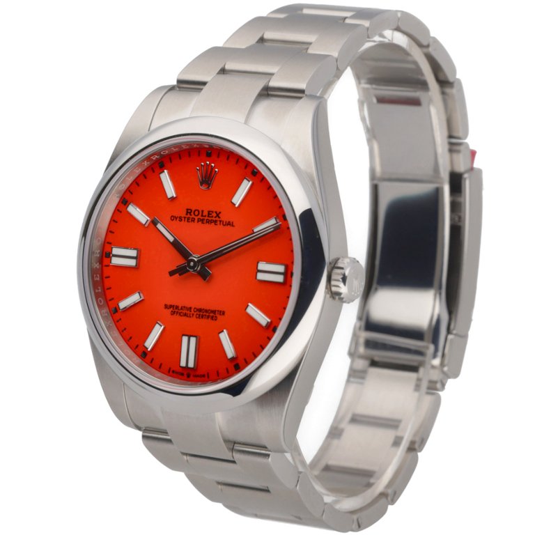 A Rolex Oyster Perpetual 41 Watch, Stainless Steel with a Coral Red Dial.