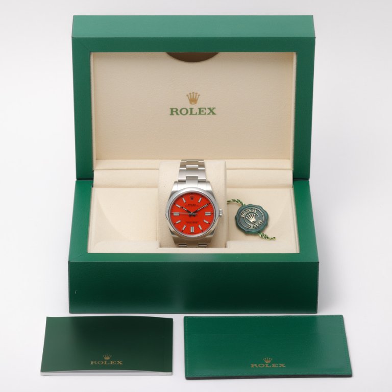 Rolex Oyster Perpetual 41 Watch, crafted from resilient stainless steel and featuring a vibrant coral red dial. With its model number 124300 and crafted in the year 2021, this timepiece epitomizes sophistication and precision engineering.
