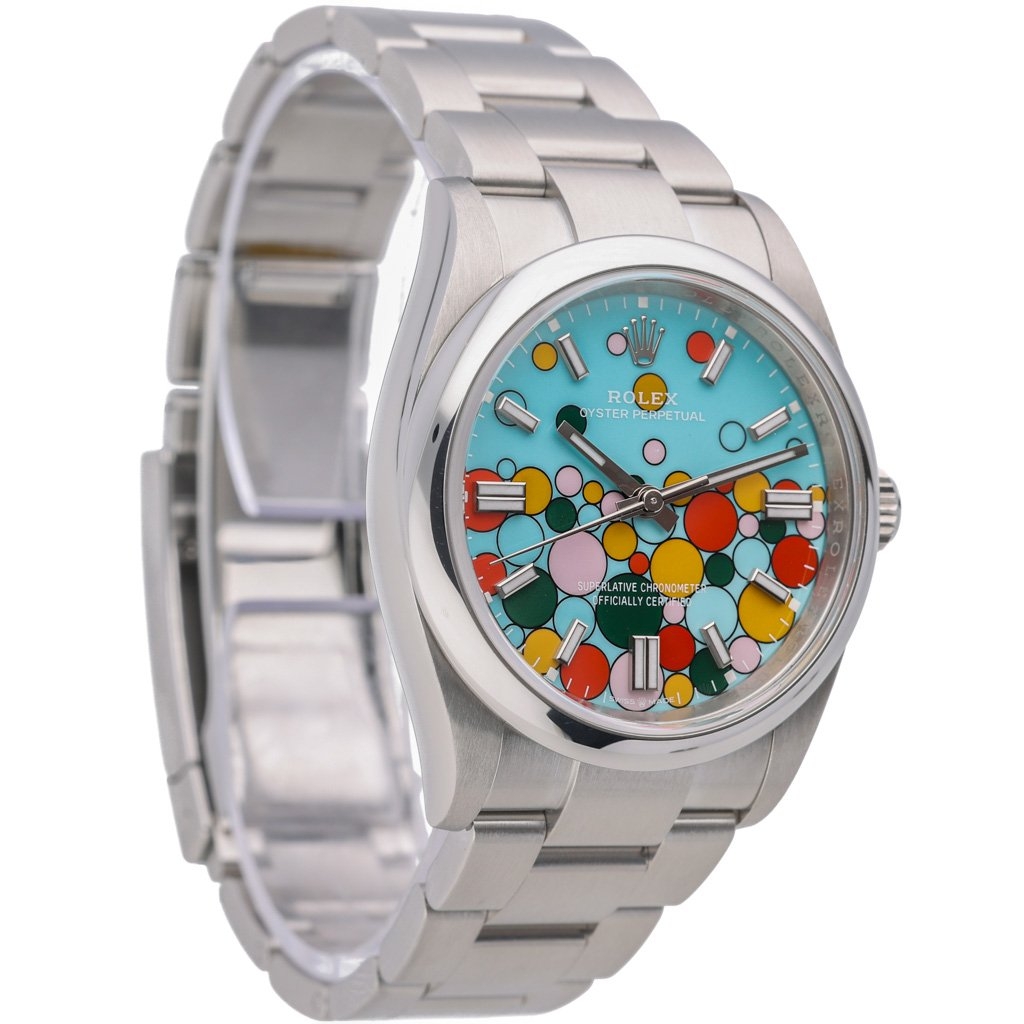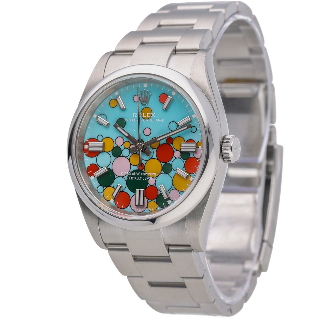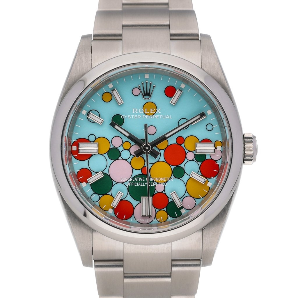 A Rolex Oyster Perpetual 36, reference 126000, is a standout piece that blends playful design with Rolex's renowned craftsmanship. Crafted from robust Oystersteel, the 36mm case offers a sleek and comfortable fit, making it suitable for both everyday wear and special occasions. The true highlight is the "Celebration Motif" dial—a dynamic array of multicoloured bubbles set against a turquoise backdrop, inspired by Rolex's earlier lacquered dials. This design has garnered attention from collectors and enthusiasts alike, including celebrities such as Tom Holland, who have been spotted wearing this distinctive model.