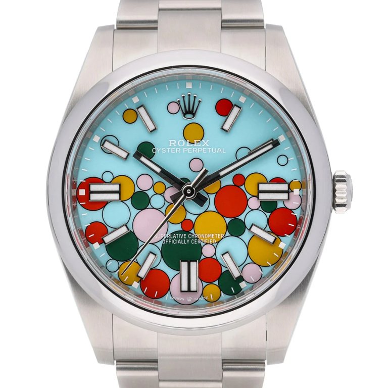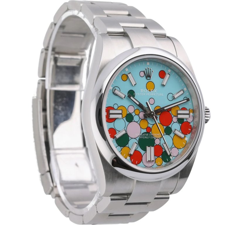 The dial of the Rolex Oyster Perpetual is a mesmerising canvas, adorned with a vibrant Turquoise Blue Celebration Motif that captivates the eye with its dynamic and celebratory design. Reminiscent of confetti scattered against a clear blue sky, the motif evokes feelings of joy and excitement, making it the perfect companion for life's most memorable moments. This unique dial serves as a testament to Rolex's commitment to innovation and creativity, pushing the boundaries of traditional watchmaking to create something truly extraordinary.