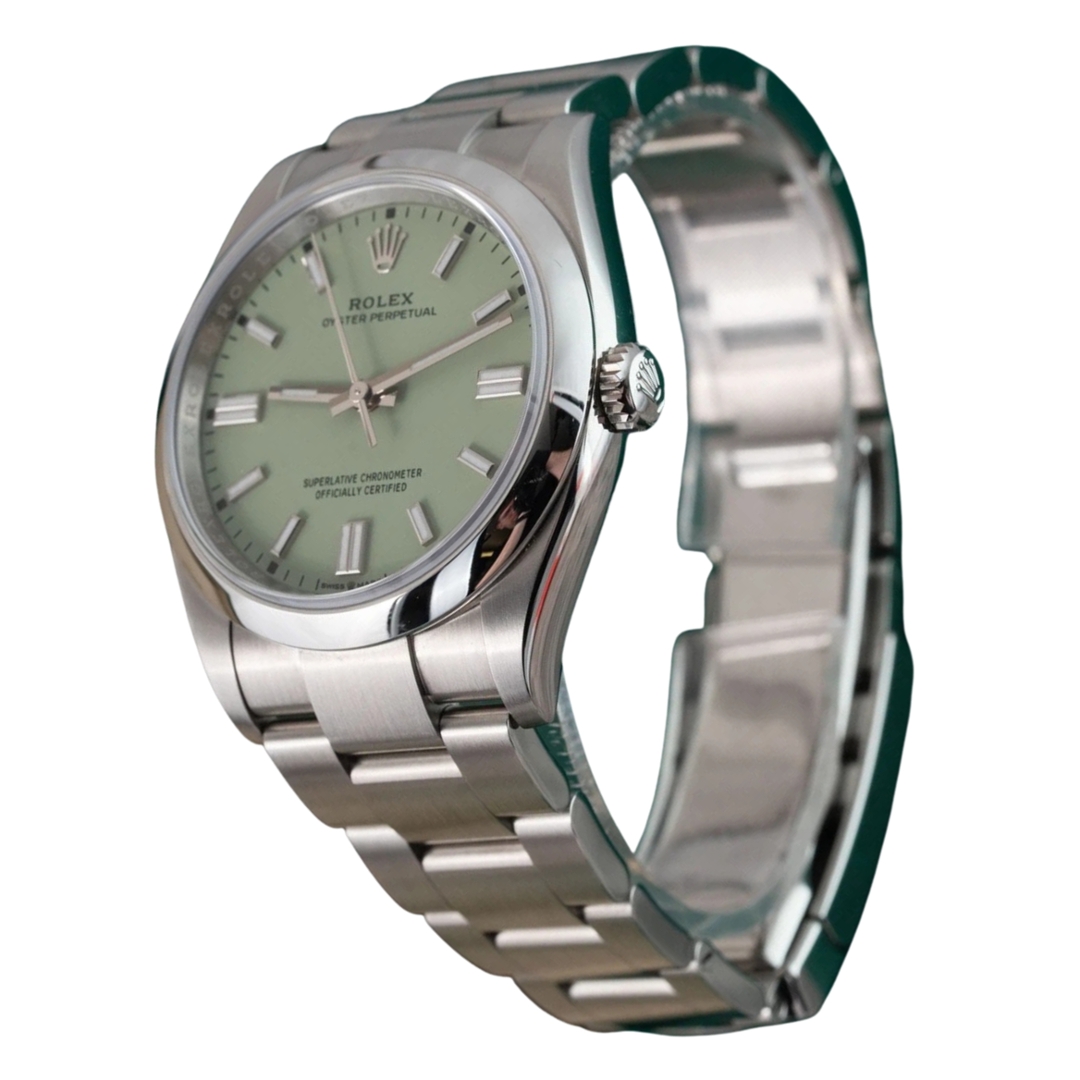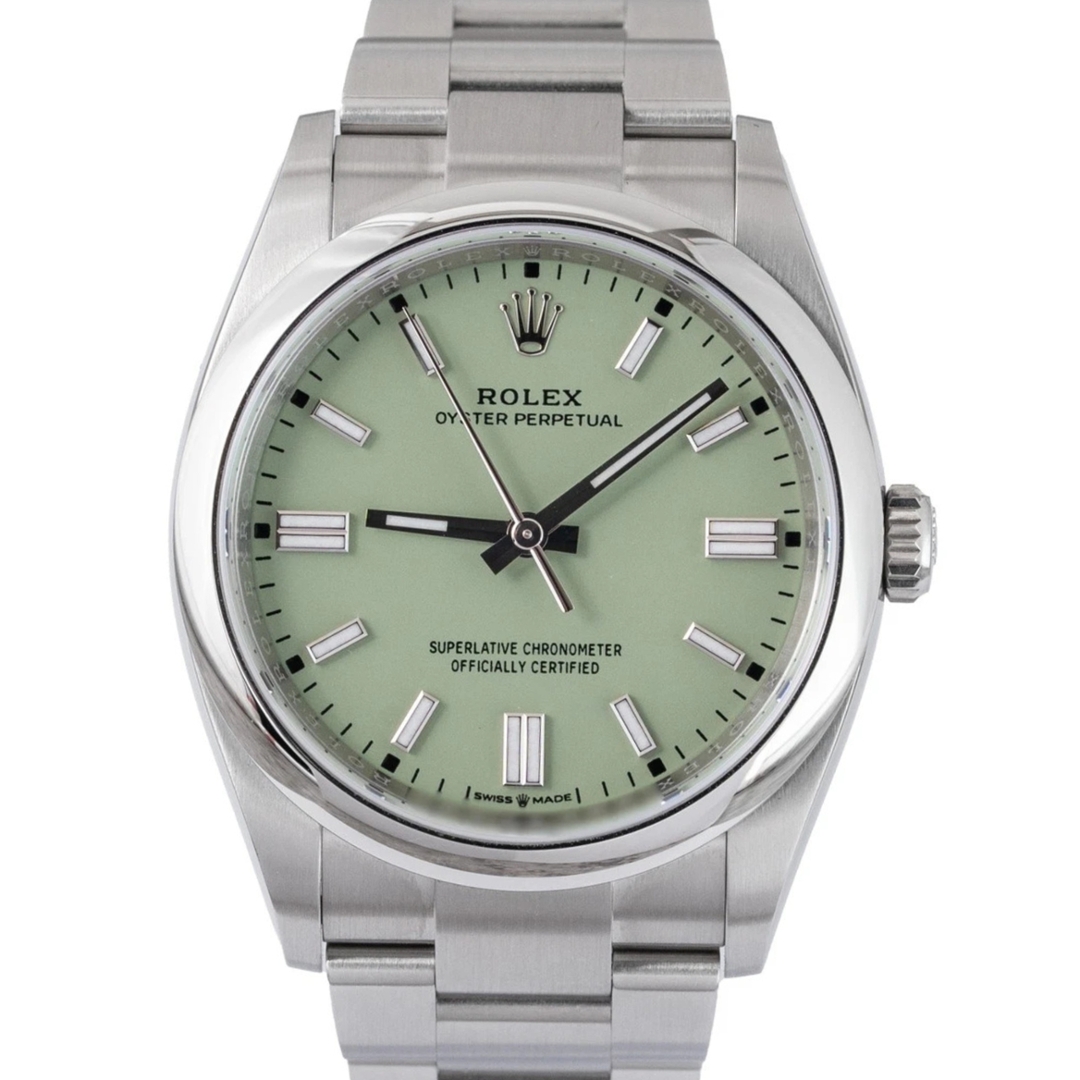 A Rolex Oyster Perpetual Watch, Stainless Steel on a Pistachio Dial