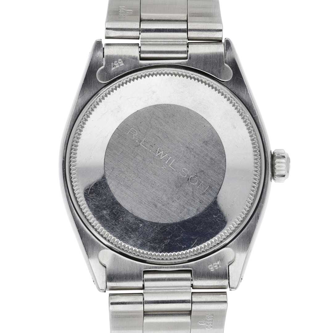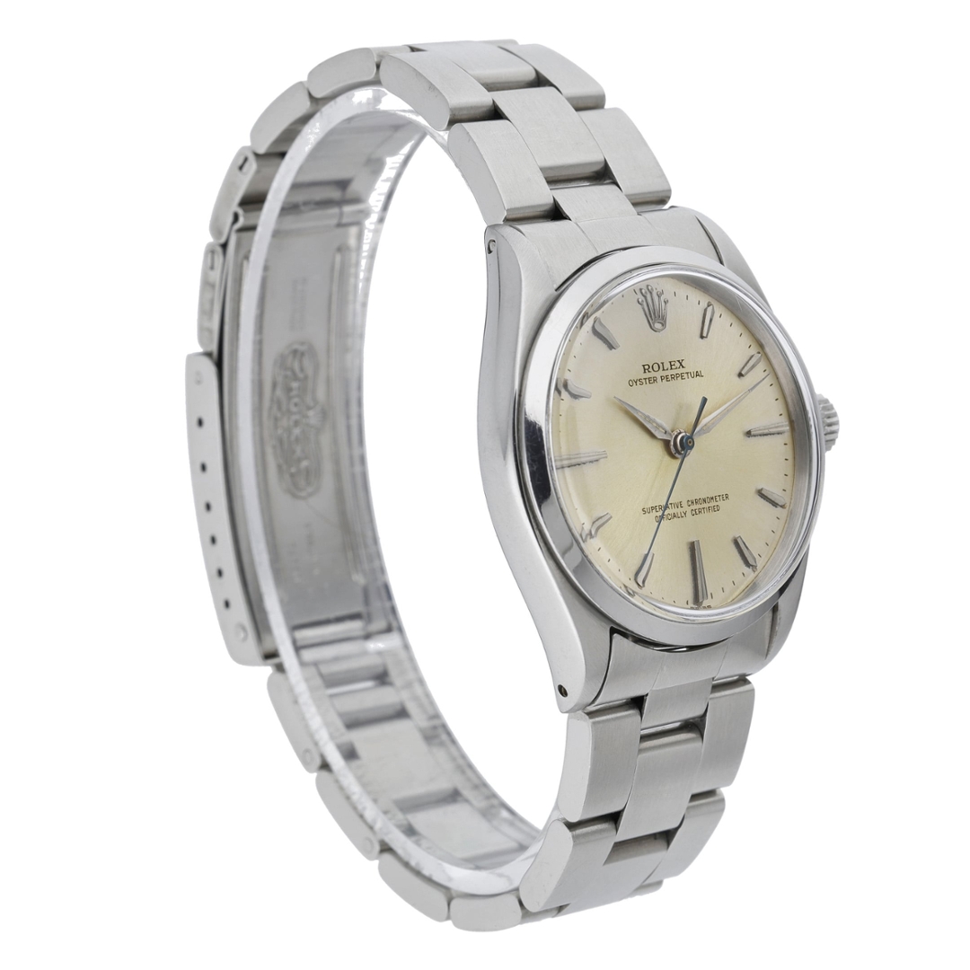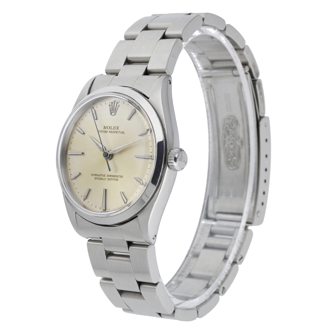 A Rolex Oyster Perpetual 1002, this 34mm stainless-steel example from 1960 represents one of the most elegant and historically significant references from the mid-century Rolex catalogue. The silver sunburst dial retains its classic minimalist layout, offering a clean and timeless aesthetic that has become increasingly desirable among vintage collectors. With its slim case profile, smooth bezel and understated design, the 1002 embodies the purest expression of early Oyster Perpetual craftsmanship.