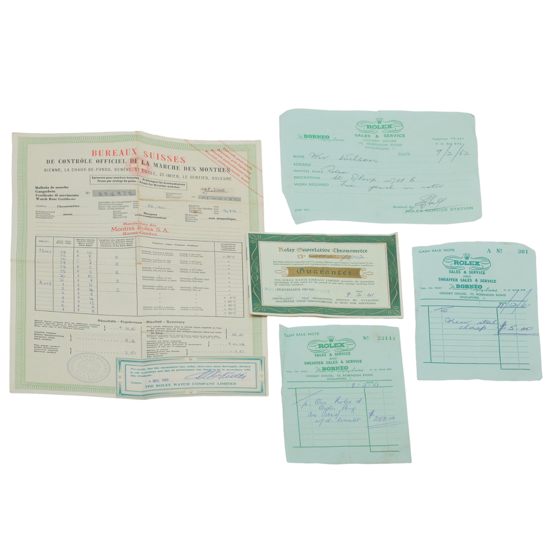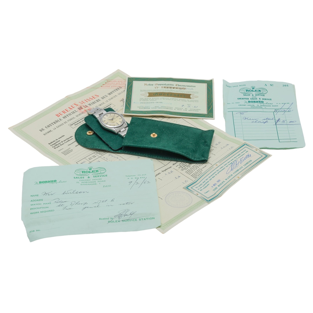 This example is made even more exceptional by the presence of its original 1960 Rolex paperwork, including period guarantee documents, timing certificates and original service notes — a level of documentation rarely seen with watches of this age. Such provenance significantly enhances both its collectability and long-term value, particularly for early automatic Oyster models. Presented in vintage condition, consistent with careful, honest wear, it remains mechanically sound and retains the charm and authenticity expected of a mid-century Rolex.
