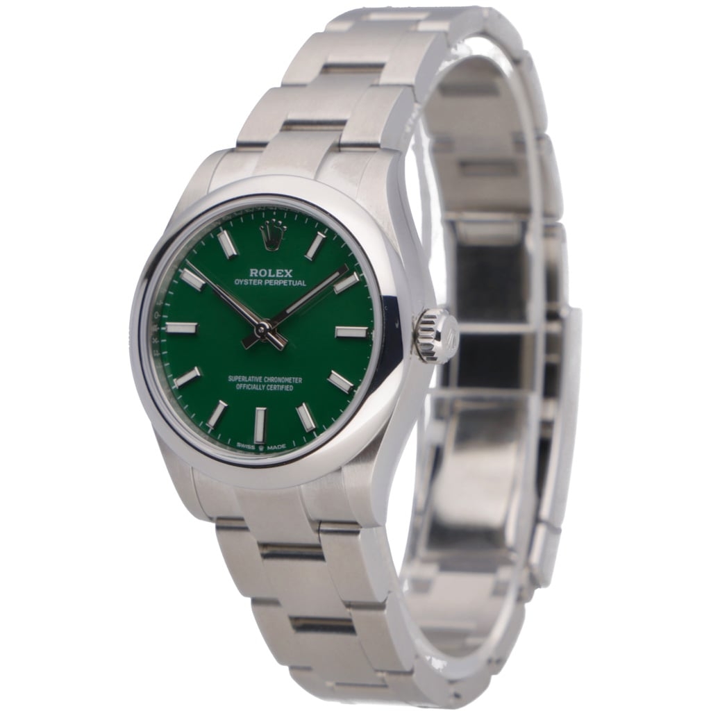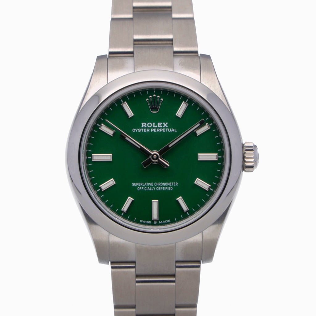 A Rolex Oyster Perpetual Watch, Stainless Steel with a Green Dial.