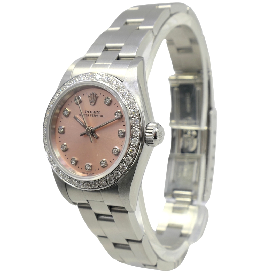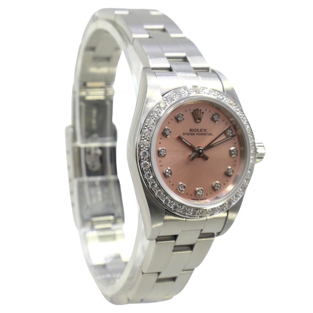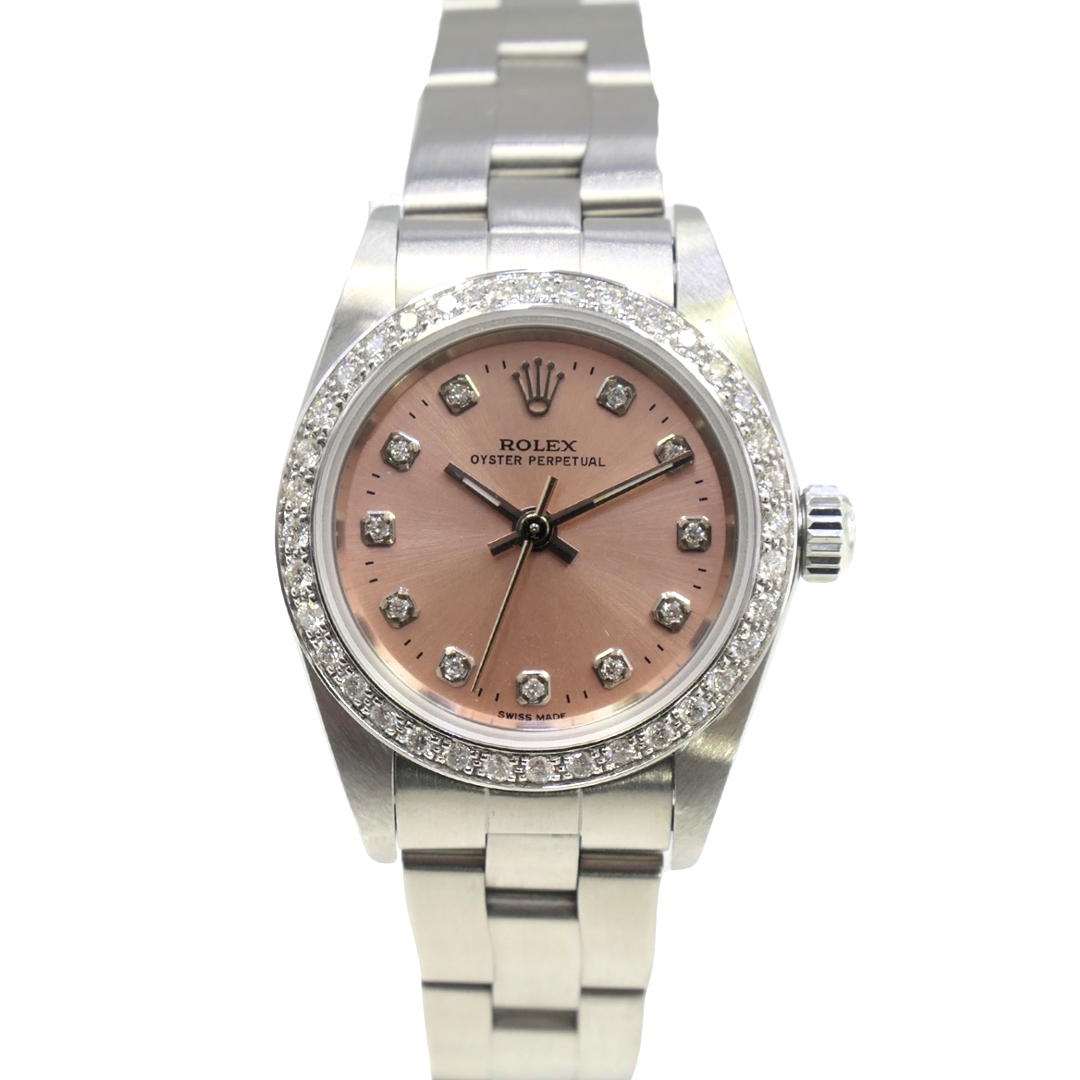 A Rolex Oyster Perpetual Watch, Stainless Steel with an Afterset Diamond Bezel on a Salmon Dial with Diamond Numerals.