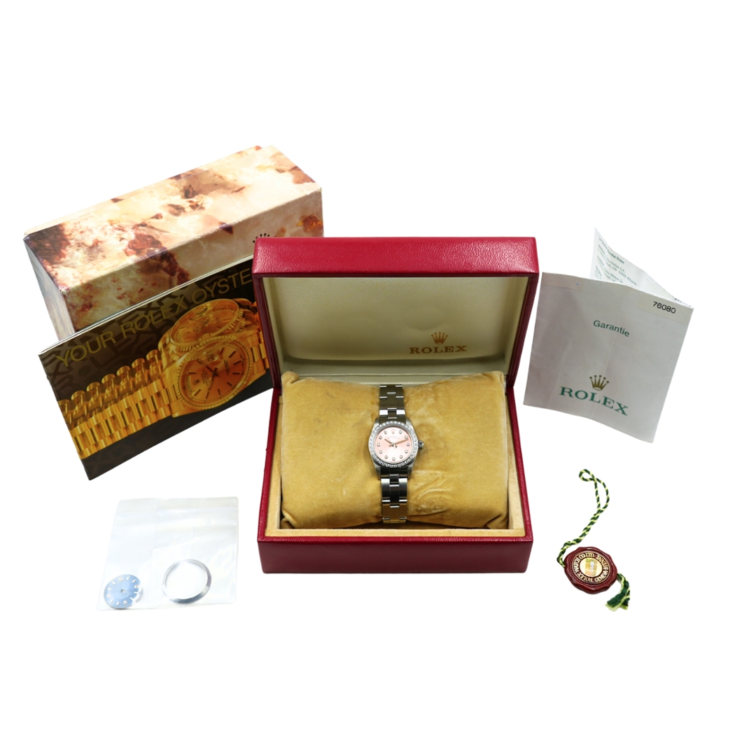 A Rolex Oyster Perpetual reference 76080 in stainless steel, presented boxed and certified with original Rolex paperwork. The 24mm case offers classic proportions, delivering refined everyday wear in a compact and elegant format.