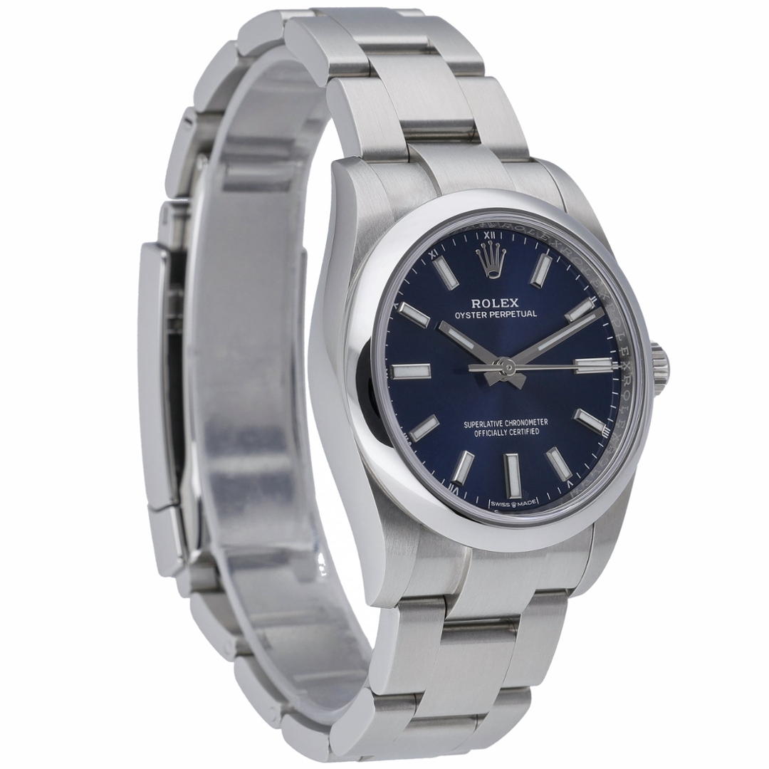 A Rolex Oyster Perpetual watch, model 124200, crafted in stainless steel and presented with a striking blue dial. The 34mm Oyster case offers balanced, versatile proportions, paired with the classic Oyster bracelet for a clean and contemporary aesthetic. Applied baton hour markers and Chromalight-filled hands provide excellent legibility, while the rich blue dial shifts beautifully across different lighting conditions, giving this understated reference a confident, modern presence.