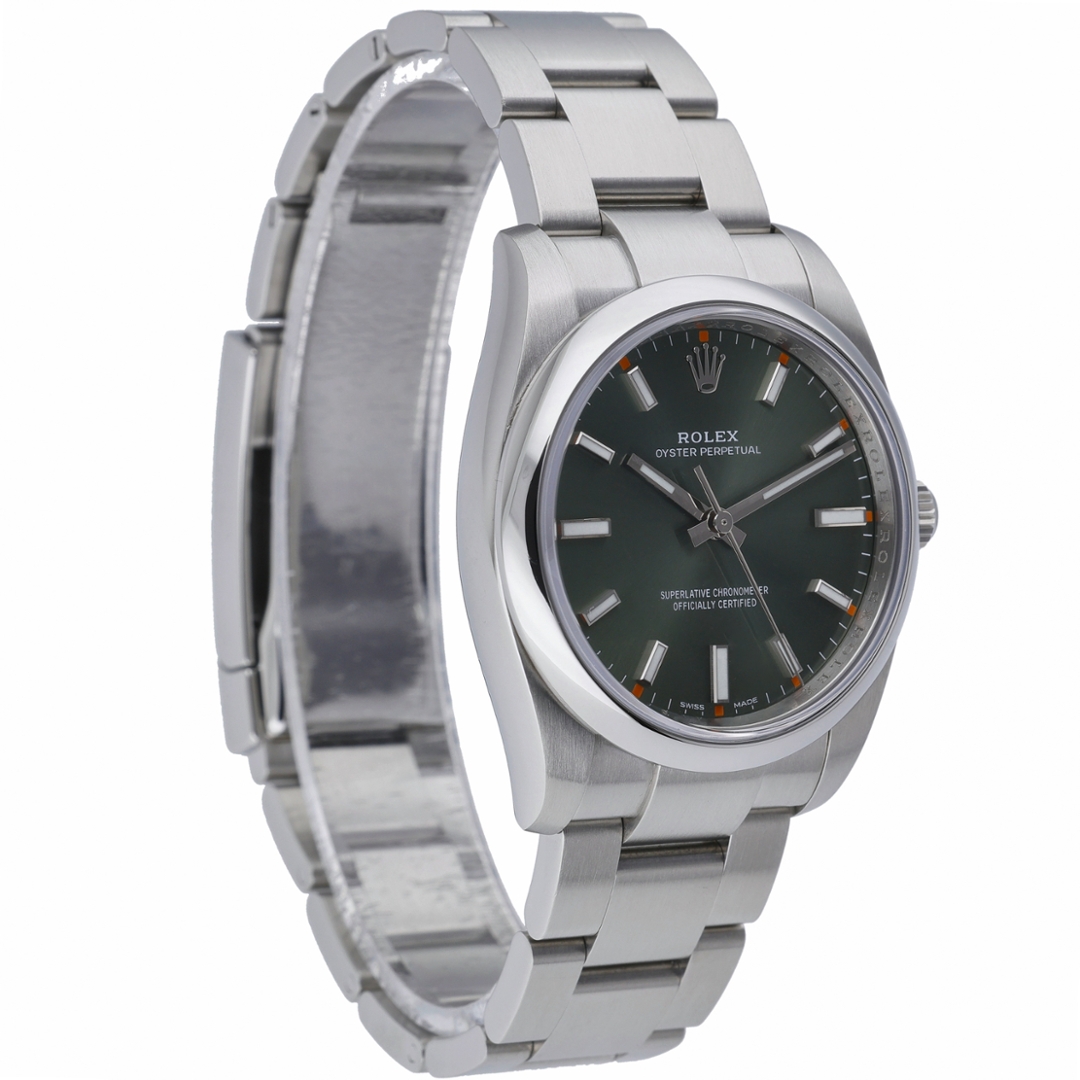 A Rolex Oyster Perpetual reference 114200 in stainless steel, presented boxed and certified with original Rolex paperwork. The 34mm case offers balanced proportions, sitting between traditional midsize and modern sport sizing, and is fitted to the classic Oyster bracelet for a clean, understated profile.