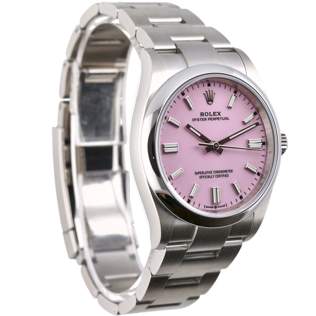 This 2025 Rolex Oyster Perpetual reference 126000 is presented in immaculate condition, featuring the highly sought-after 36mm stainless steel Oyster case paired with a soft pink dial. The balanced 36mm size remains one of the most liquid and versatile formats in the modern Rolex catalogue, appealing to both collectors and investors. The smooth bezel and Oyster bracelet create a clean, understated profile, allowing the dial colour to take centre stage while retaining everyday wearability.