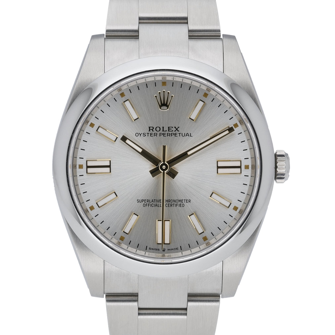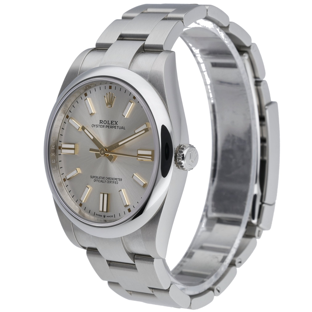 A Rolex Oyster Perpetual 41 reference 124300 in stainless steel, featuring a smooth bezel and an Oyster bracelet, embodies the purest expression of Rolex design. The silver dial delivers a clean, understated aesthetic, enhanced by applied baton hour markers and luminous hands, offering exceptional clarity and timeless versatility within a well-balanced 41mm case.