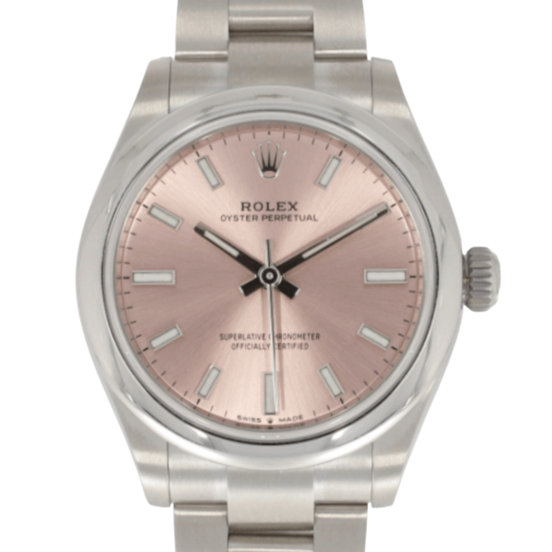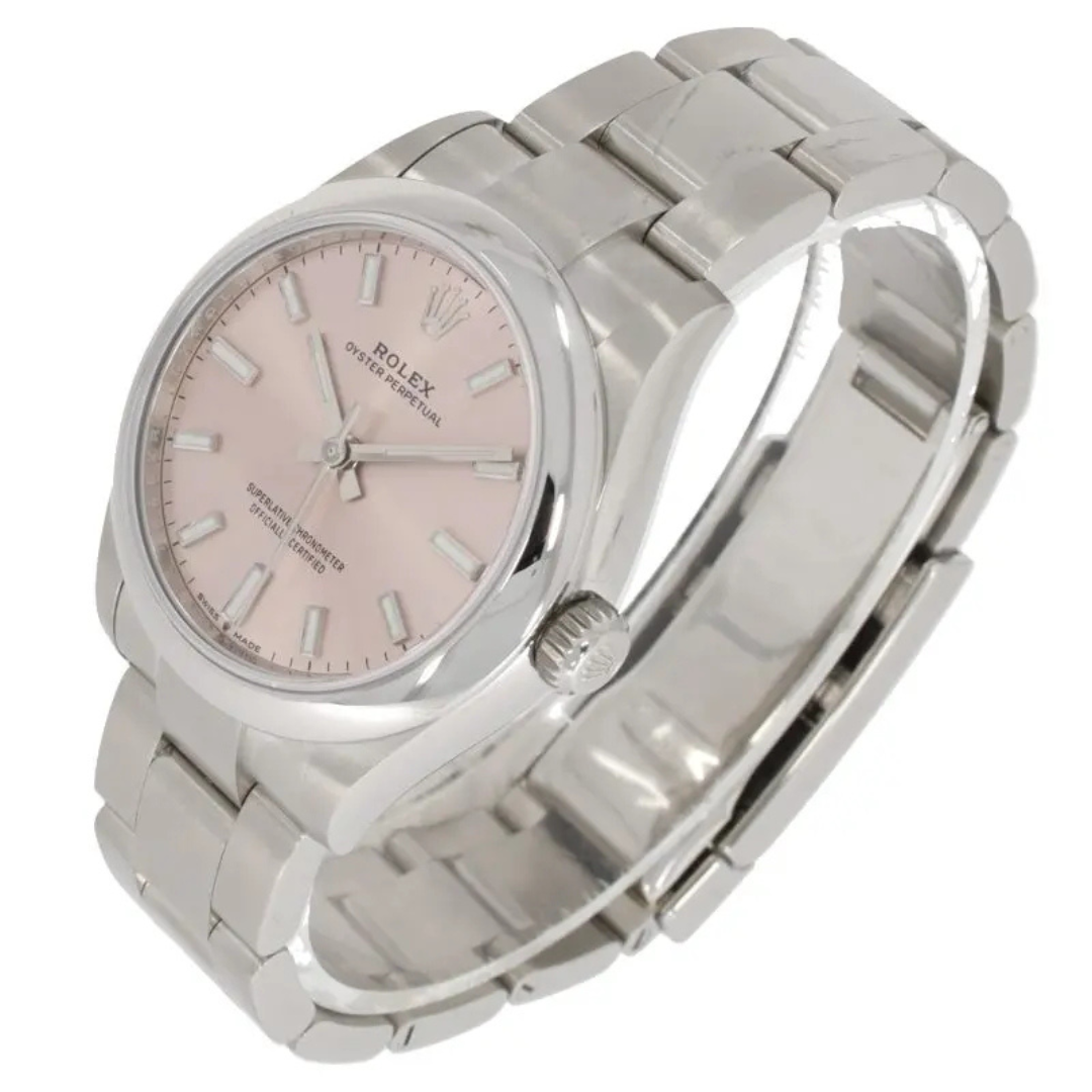 A Rolex Oyster Perpetual Watch, Stainless Steel with a Pink Dial.