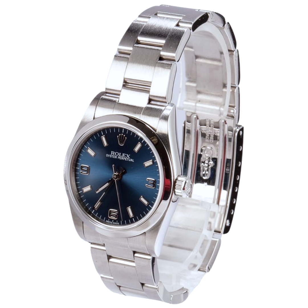 A Rolex Oyster Perpetual reference 77080 in stainless steel, featuring a deep blue sunburst dial with applied baton hour markers and distinctive Arabic numerals at 3, 6, and 9. The clean dial layout, paired with the smooth bezel and Oyster bracelet, creates a timeless, versatile aesthetic, making this a well-balanced everyday Rolex with subtle character.