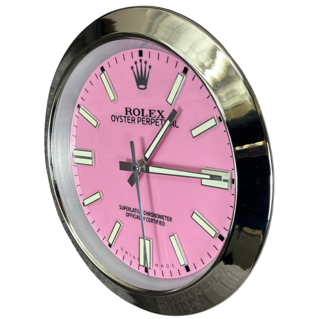 A stainless steel replica Rolex Oyster Perpetual wall clock, featuring a vibrant pink dial that delivers a bold and contemporary twist on a classic design. The clean, minimalist layout is enhanced by baton-style hour markers and sleek hands, creating a striking yet balanced aesthetic that immediately stands out while maintaining the timeless appeal of the Oyster line.