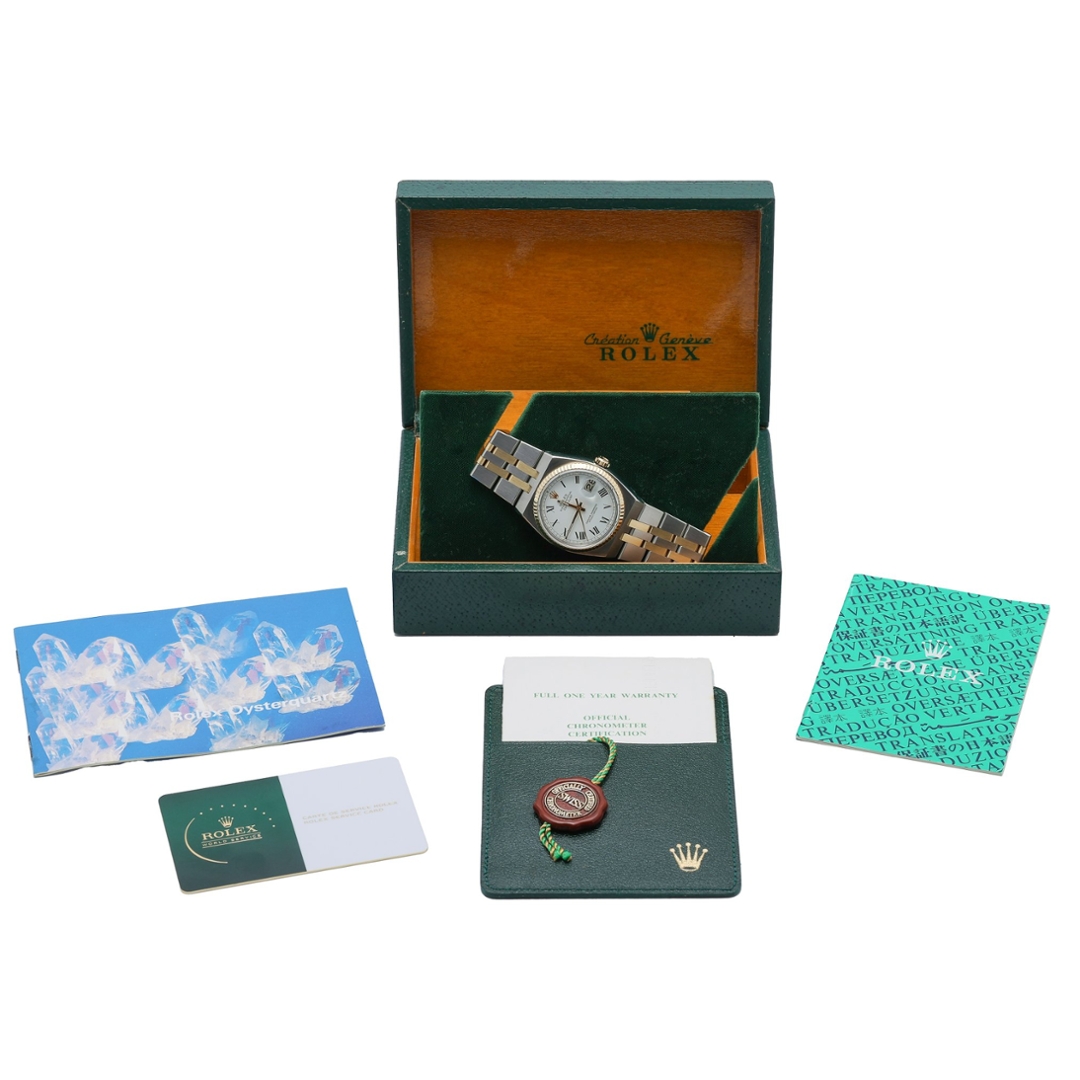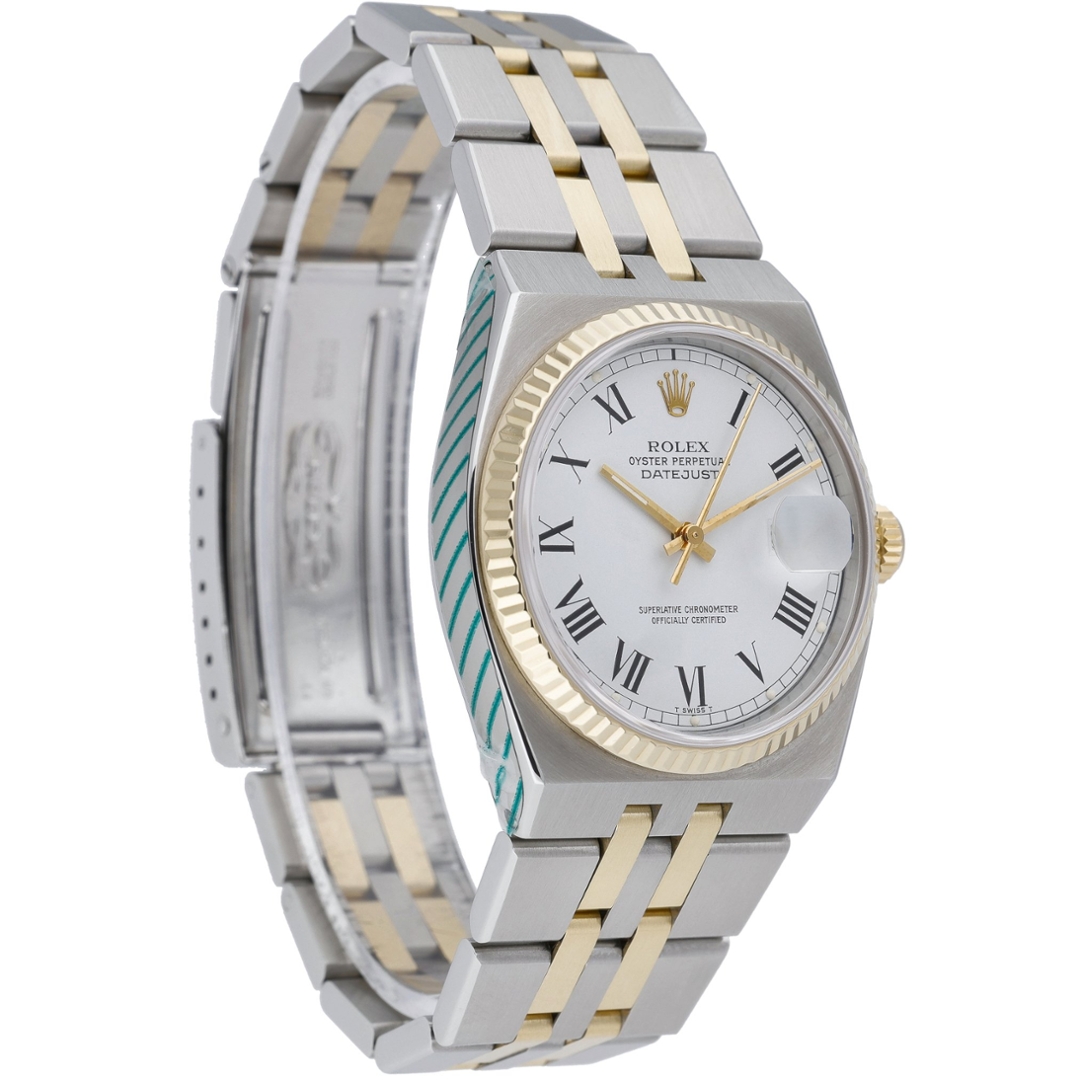 A bi-metal Rolex Oysterquartz Datejust, crafted in stainless steel and 18ct yellow gold, this reference 17013 delivers one of the most distinctive profiles in Rolex history. The sharp, angular case architecture and integrated bracelet, while the yellow gold fluted bezel adds classic Rolex presence. The white Roman numeral dial offers clean symmetry and strong legibility, giving the model a timeless elegance that separates it from traditional Datejust references.