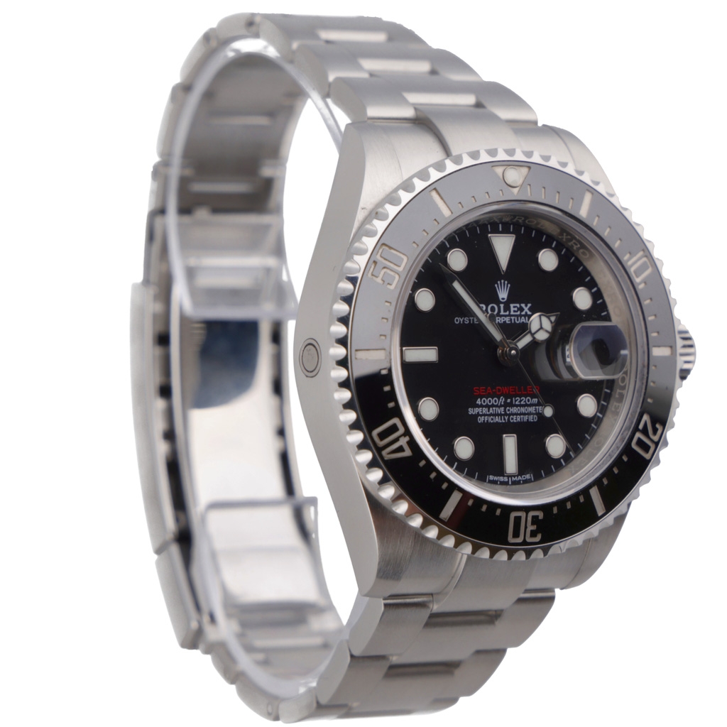 A Rolex Sea-Dweller Watch, Stainless Steel with a Black Bezel and Dial with Red "Sea-Dweller" Text.