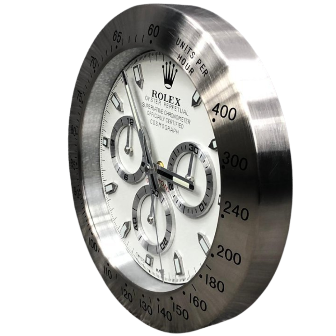 The stainless steel replica Rolex white face silver Daytona wall clock epitomises elegance and precision, faithfully capturing the essence of the iconic Rolex Daytona timepiece. Encased in polished stainless steel, this wall clock radiates luxury and durability, echoing the craftsmanship synonymous with Rolex. Standing approximately 14 inches tall and wide, it commands attention as a sophisticated centrepiece in any room or environment.
