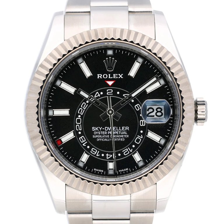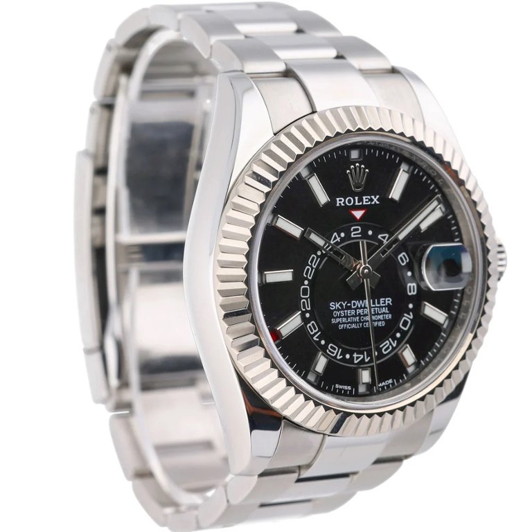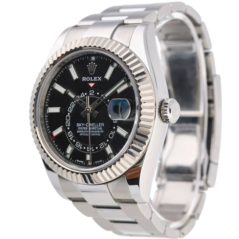 A Rolex Sky-Dweller 326934, crafted in stainless steel and featuring an 18ct white gold fluted bezel with a sleek black dial — a bold, refined combination in one of Rolex’s most technically sophisticated models. With a 42mm Oyster case and commanding profile, this reference pairs advanced function with unmistakable Rolex elegance.