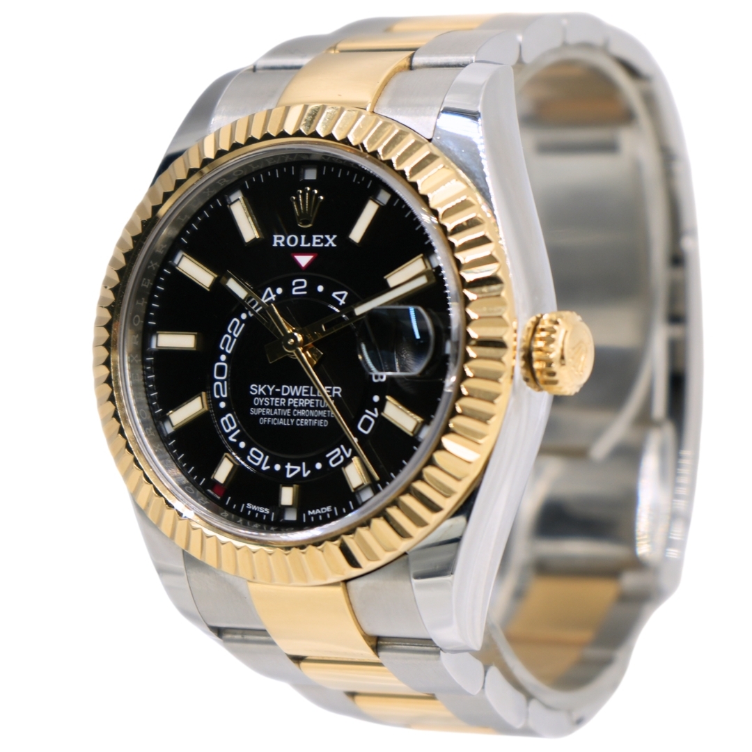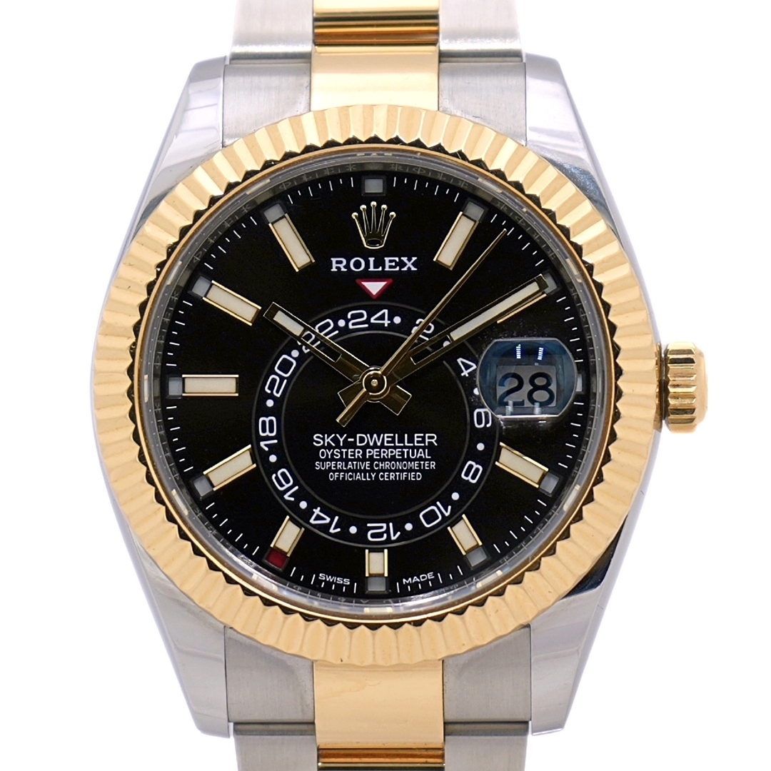 A Bi-Metal Rolex Sky-Dweller (Model: 326933), introduced in 2021, is designed with the discerning customer in mind, offering a perfect blend of luxury, precision, and practicality. Its 42mm case, crafted from stainless steel and 18ct yellow gold, ensures durability while exuding a timeless elegance. The black dial provides a striking, modern contrast to the polished hour markers and hands, ensuring legibility even in low-light conditions.
