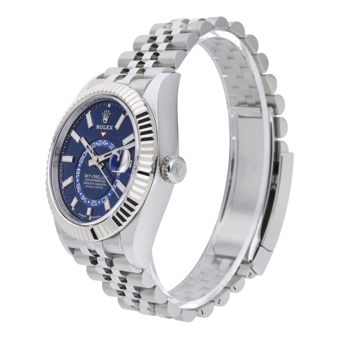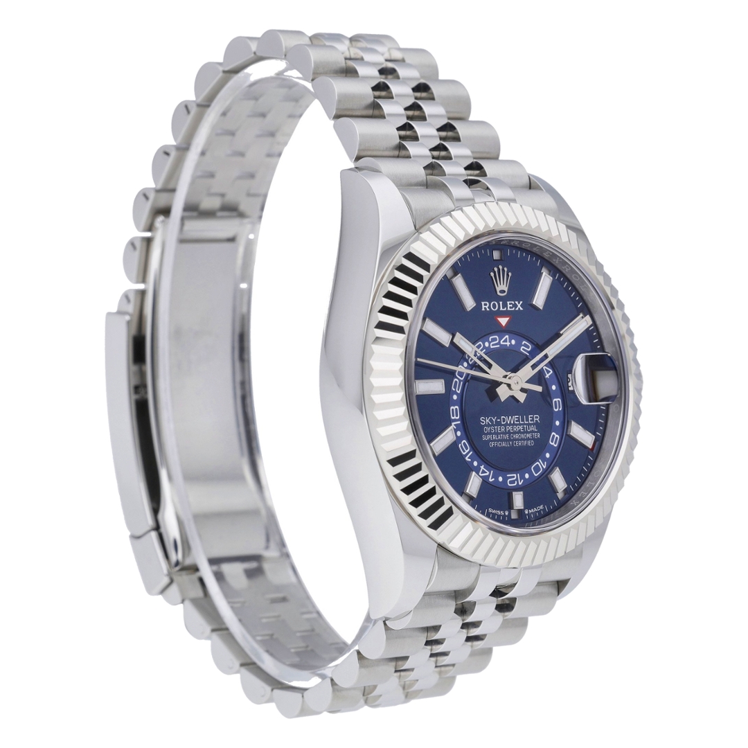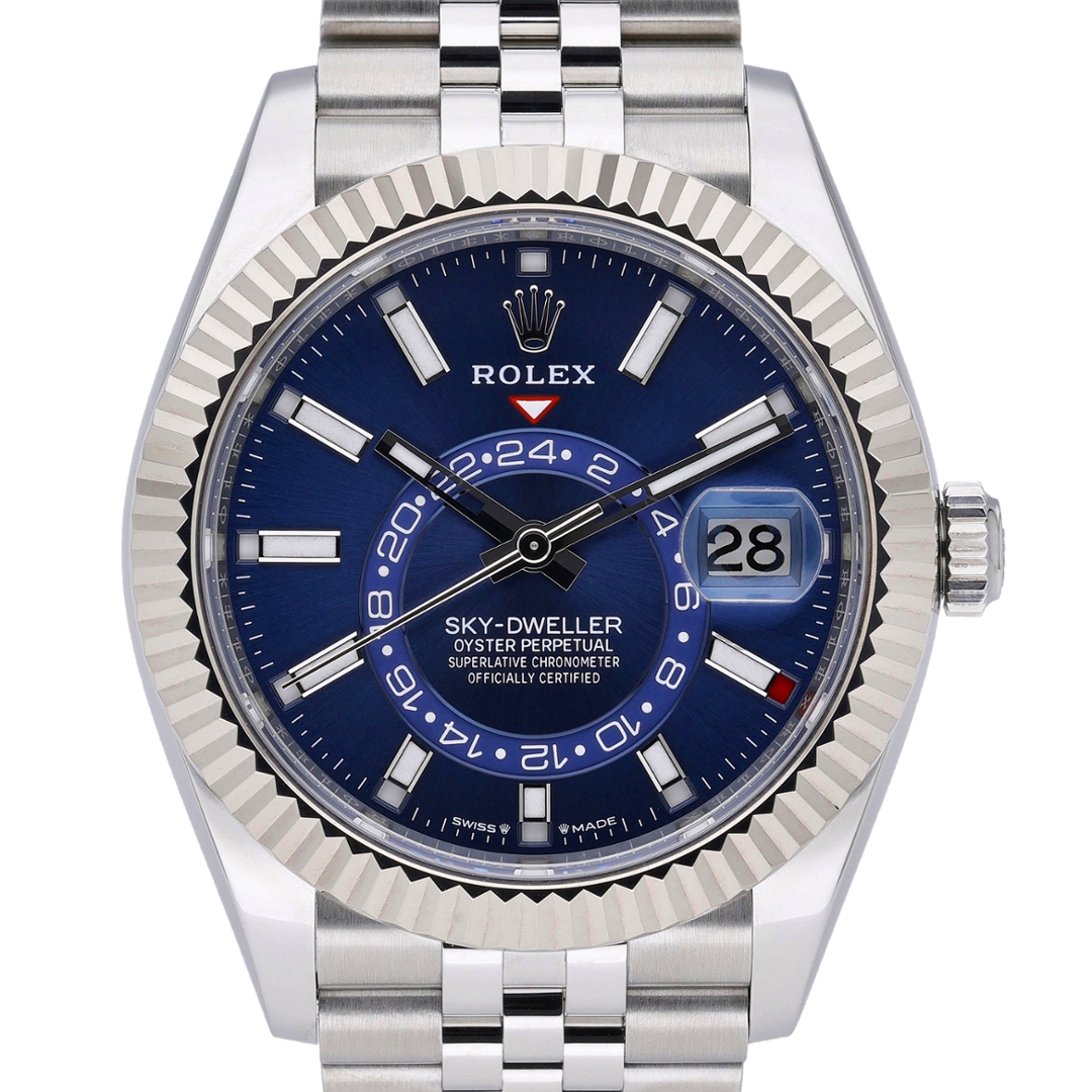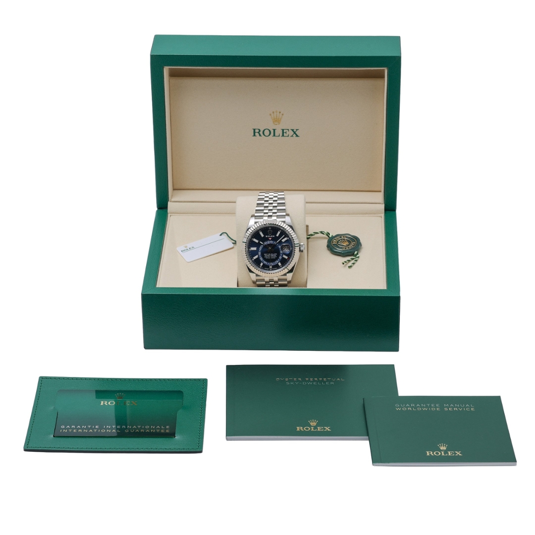 A Rolex Sky-Dweller 336934 is one of the most sought-after modern Rolex references, blending technical mastery with undeniable prestige. This 2025 example, crafted in robust Oystersteel with an 18ct white gold fluted bezel, features the highly desirable blue dial — a configuration that has become a cornerstone for collectors and investors alike.